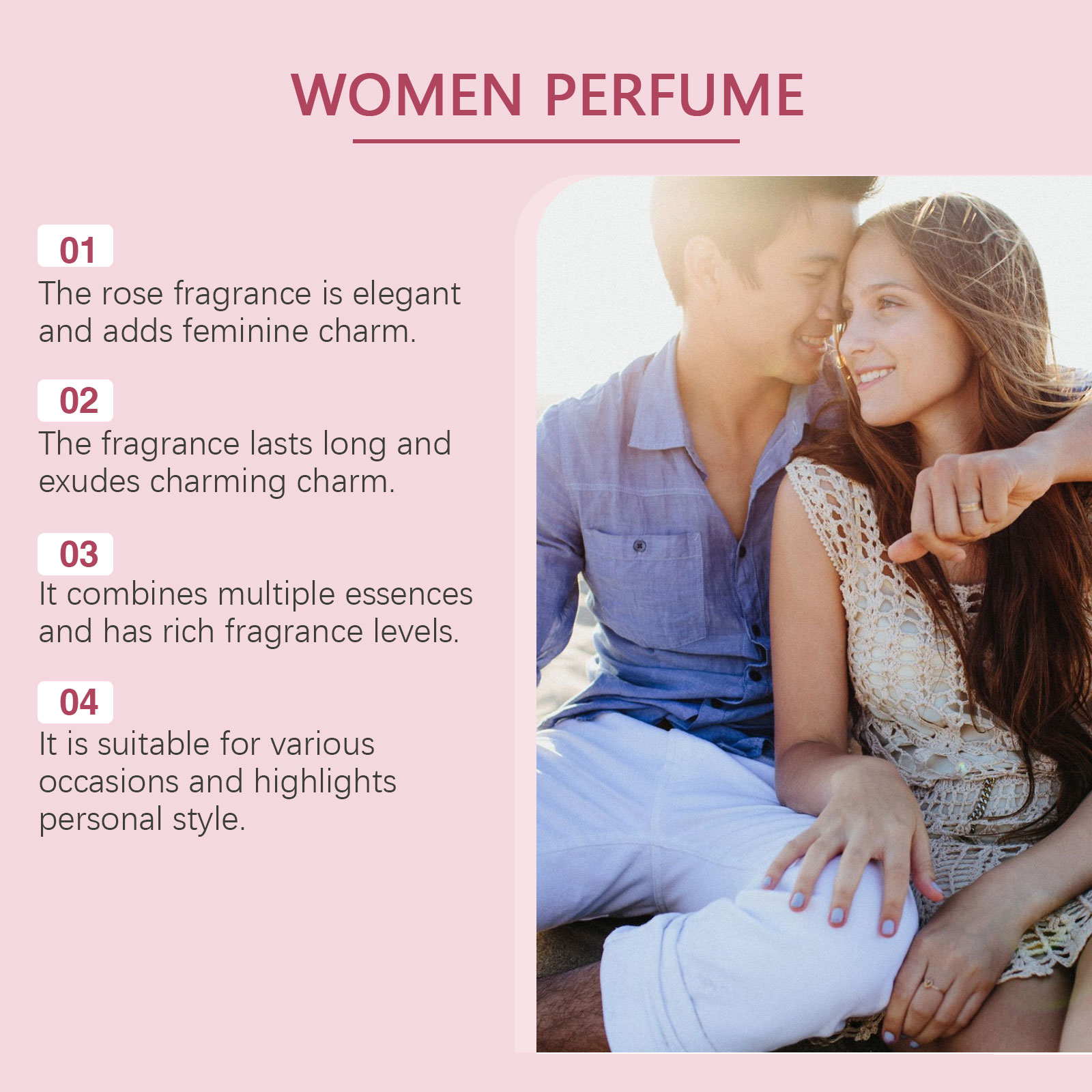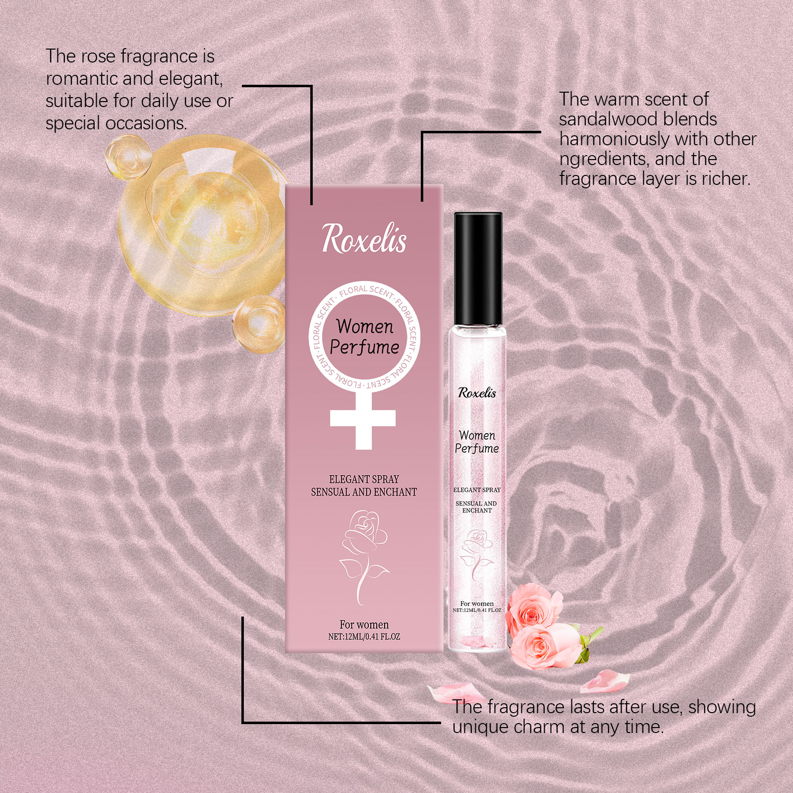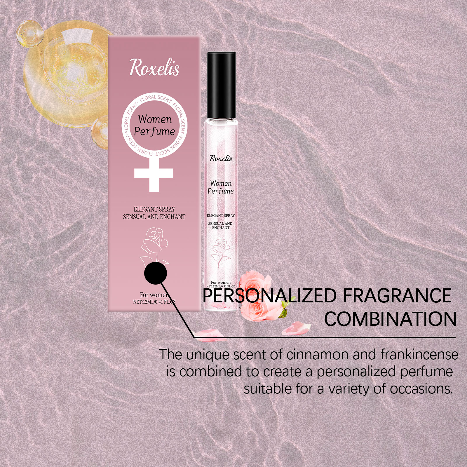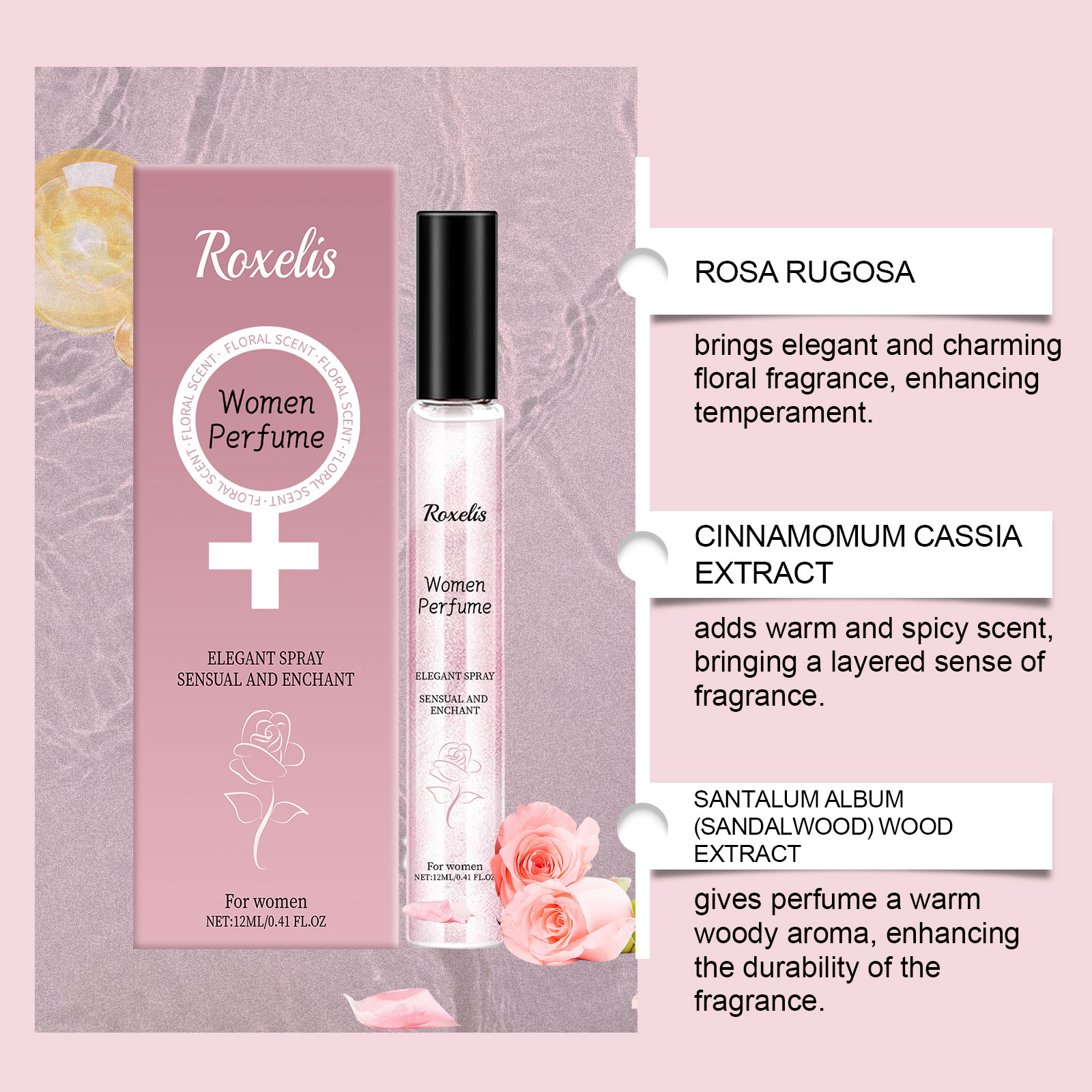 Our light floral Charm perfume contains rose extract, cinnamon extract, sandalwood extract. It can bring elegant and charming flowers, enhance the temperament. Adds a warm and spicy scent. Brings a layered scent. Gives the perfume a warm woody aroma and enhances its durability. How to use it is very simple: 1. Open the bottle cap. 2. Press the nozzle and spray the perfume on your neck, wrists or other parts of your body. Rose essence brings soft fragrance, enhances temperament and highlights feminine charm; Sandalwood extract gives the perfume a warm woody scent and enhances the overall layering.
