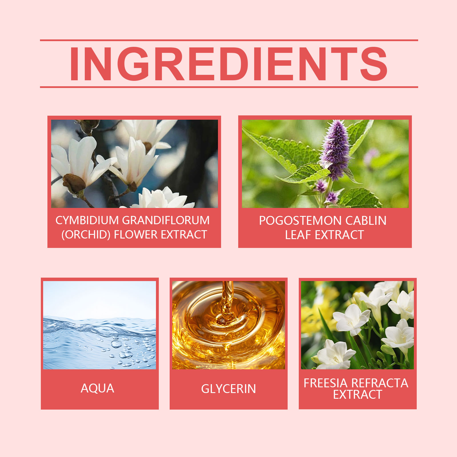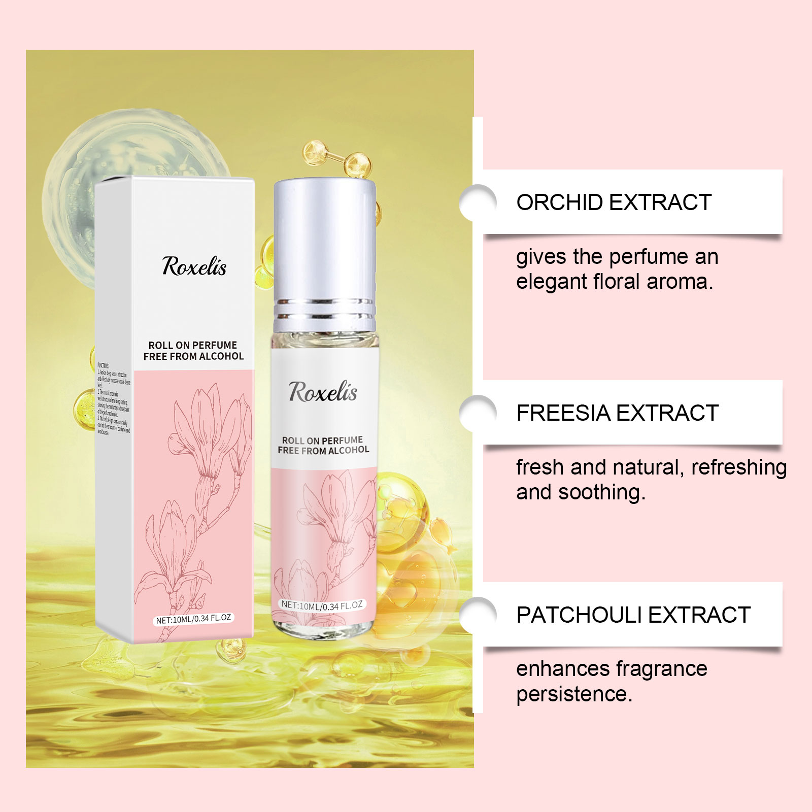 Our elegant Orchid perfume contains glycerin, orchid extract, freesia extract. It can give perfume an elegant floral scent. Fresh and natural, refreshing and soothing. Enhance the durability of the fragrance. Its application is simple: Use a rolling ball design to apply the perfume to the wrists, neck, behind the ears, knees and other pulse points. Use 1-2 times at a time for optimal fragrance distribution. Orchid extract makes the perfume exude a unique and elegant fragrance, exuding a noble temperament. Patchouli extract enhances the perfume's staying power and the scent lasts all day.