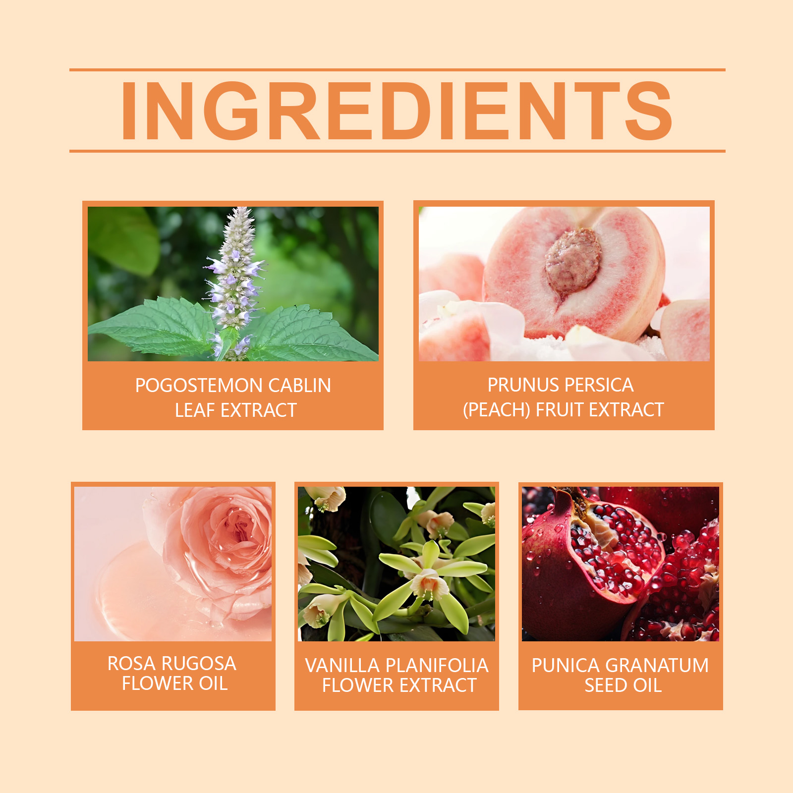 Our fragrance water (Peach Vanilla) contains pomegranate seed oil, peach fruit extract, vanilla orchid extract. It provides antioxidants, brightens skin and adds a fruity aroma. Stabilize the base. Extend the duration of the fragrance and give a deep aftertaste. Refresh your mind and help improve your mood, giving you a feeling of freshness and energy. How to use it is very simple: 1. Open the bottle cap. 2. Gently roll the perfume on your wrists, back of your neck, behind your ears, and behind your knees and wait for the scent to evaporate. One touch, confidence doubled, the aura completely opened. Multiple olfactory levels bring deep sensory enjoyment.
