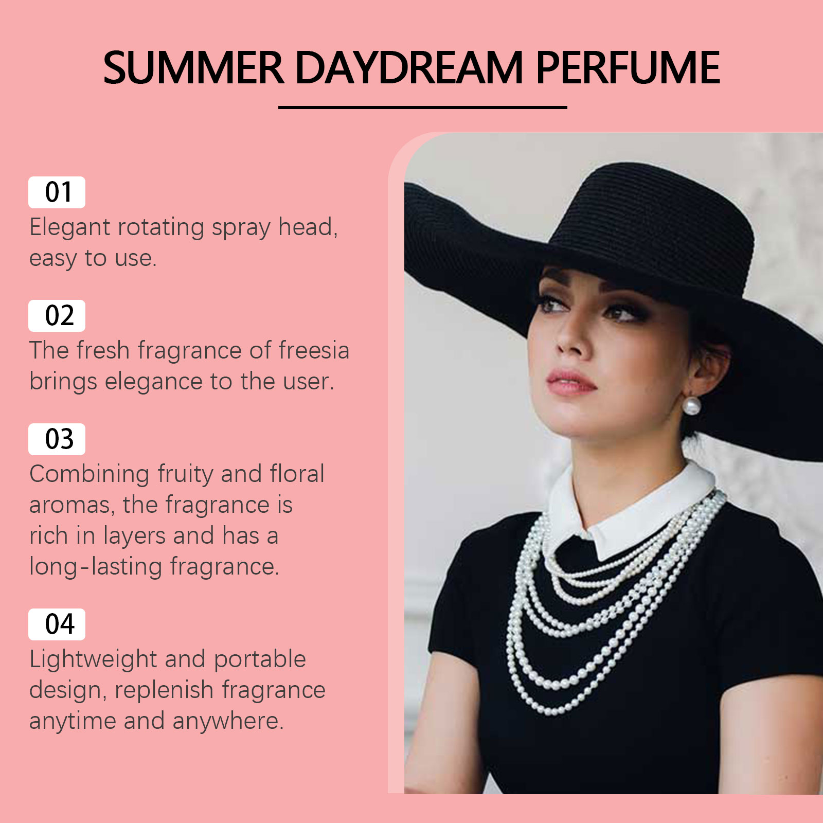 Our rotating perfume spray contains freesia extract and rose oil. It can add vitality and charm. Its use method is very simple: take a proper amount of this product, evenly spray on the wrists, behind the ears, neck and other places that need fragrance. And can provide a unique fruity and refreshing feeling.