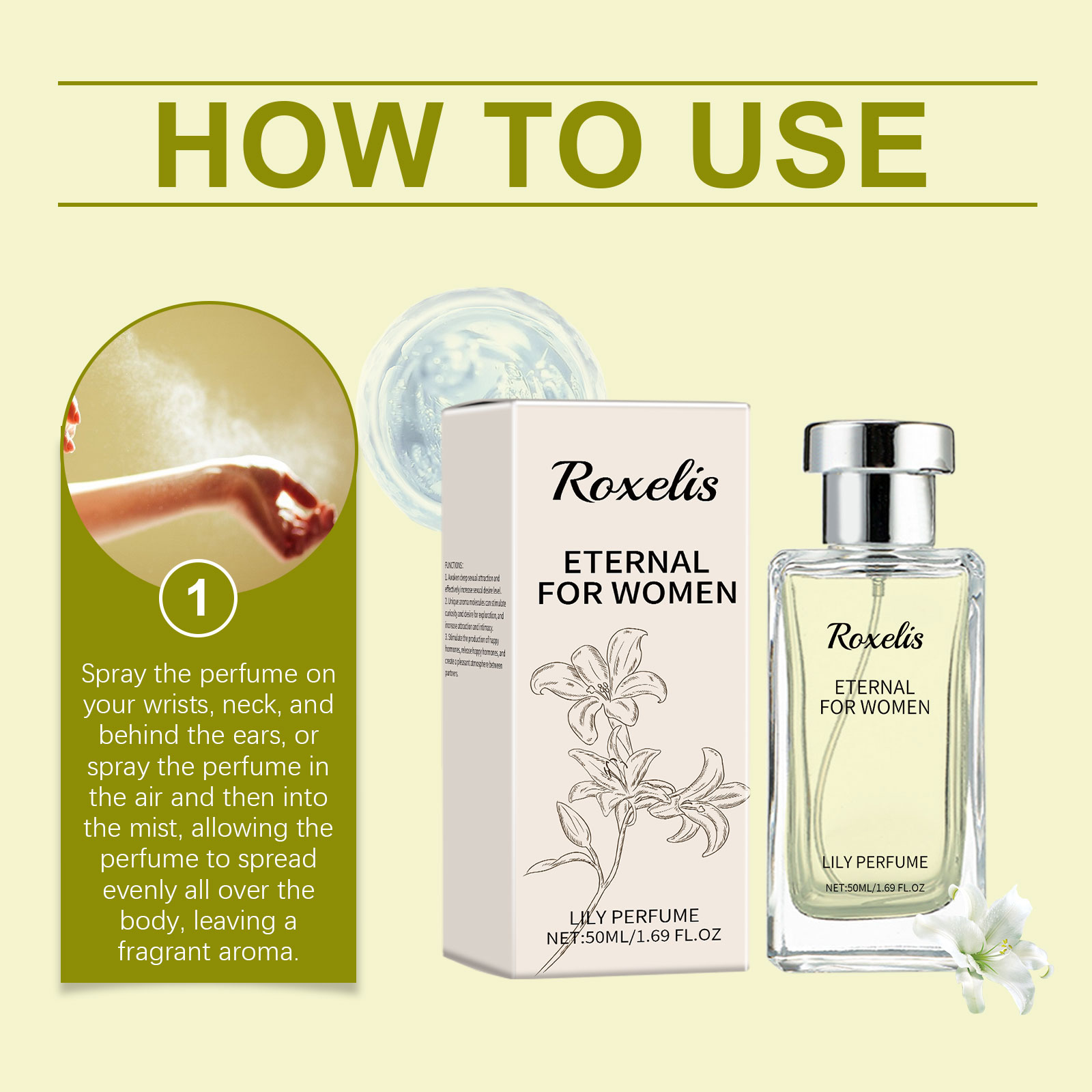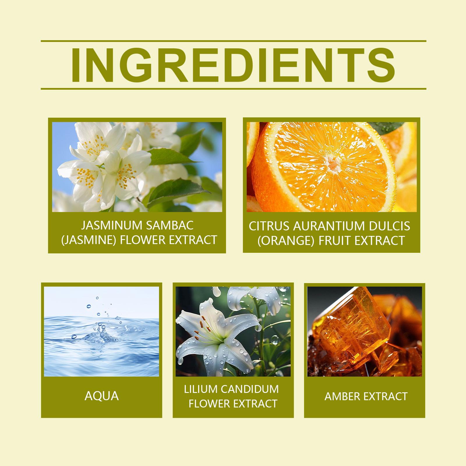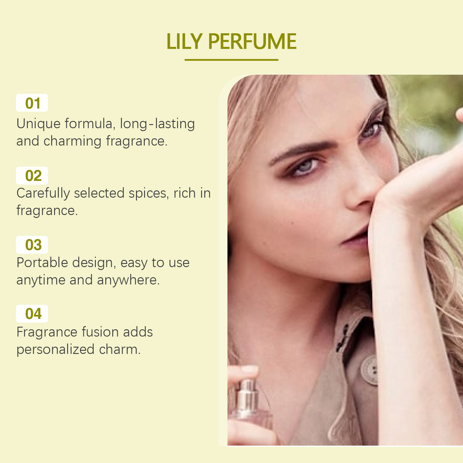 Our lily perfume contains orange extract and amber extract. It can give a warm tone, lasting and charming. Its use is simple: spray the perfume on the wrists, neck, behind the ears, or spray the perfume in the air and then into the mist, so that the perfume evenly spread throughout the body, leaving a fragrant aroma. And can release the charm, add deep details, create layers of long-lasting fragrance, make you more unique charming, full of elegant charm.
