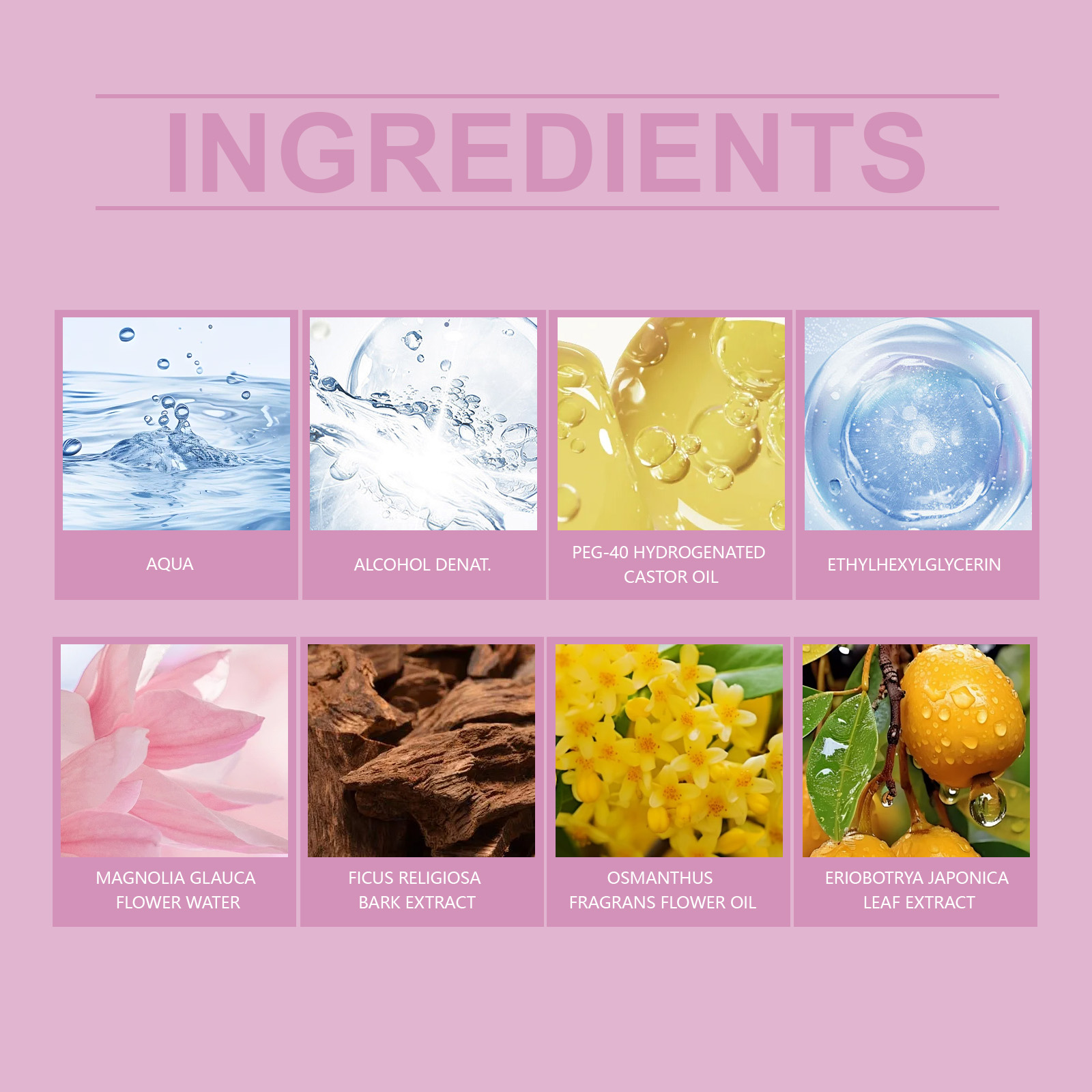 Our Magnolia Linden Brazil Charm Perfume contains denatured ethanol, PEG-40 hydrogenated castor oil. It can blend floral tones to release charm and add profound detail. Awaken and energize the senses. The way to use it is simple: clean and dry skin. Apply an appropriate amount of perfume to the wrists, behind the ears, neck and other parts of the body. And the scent lasts long, giving you confidence throughout the day.