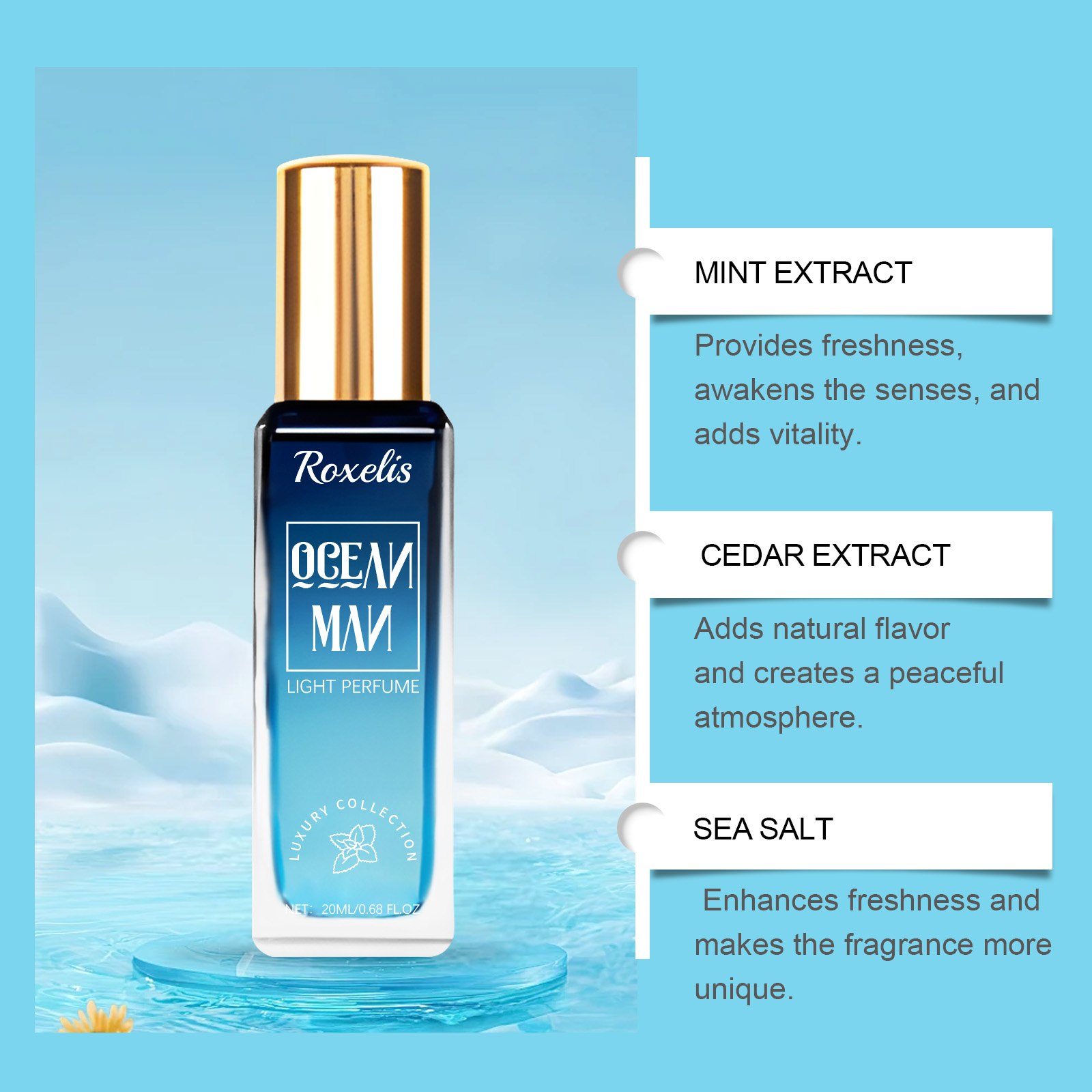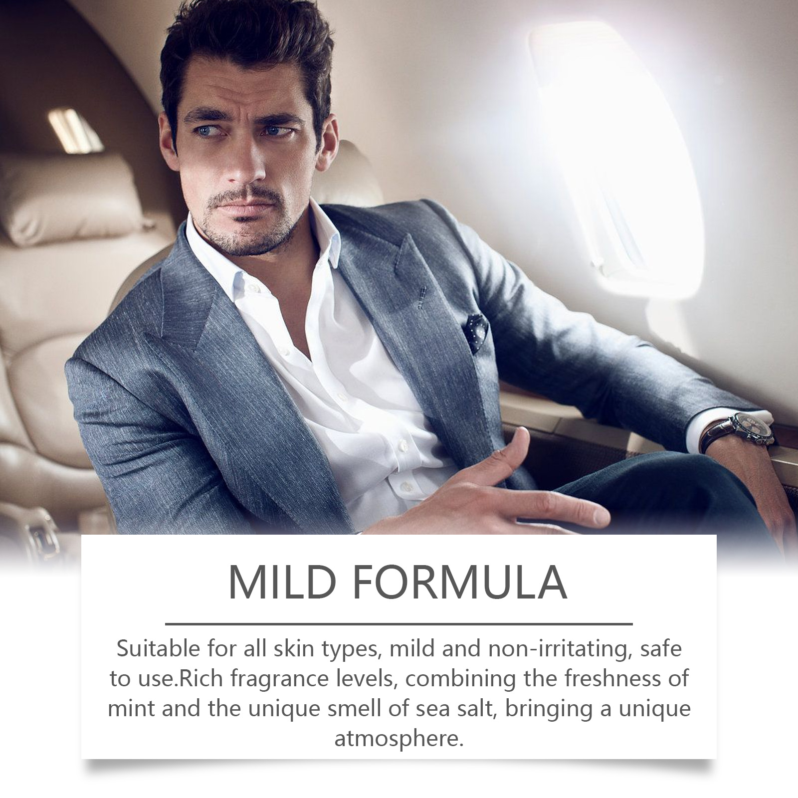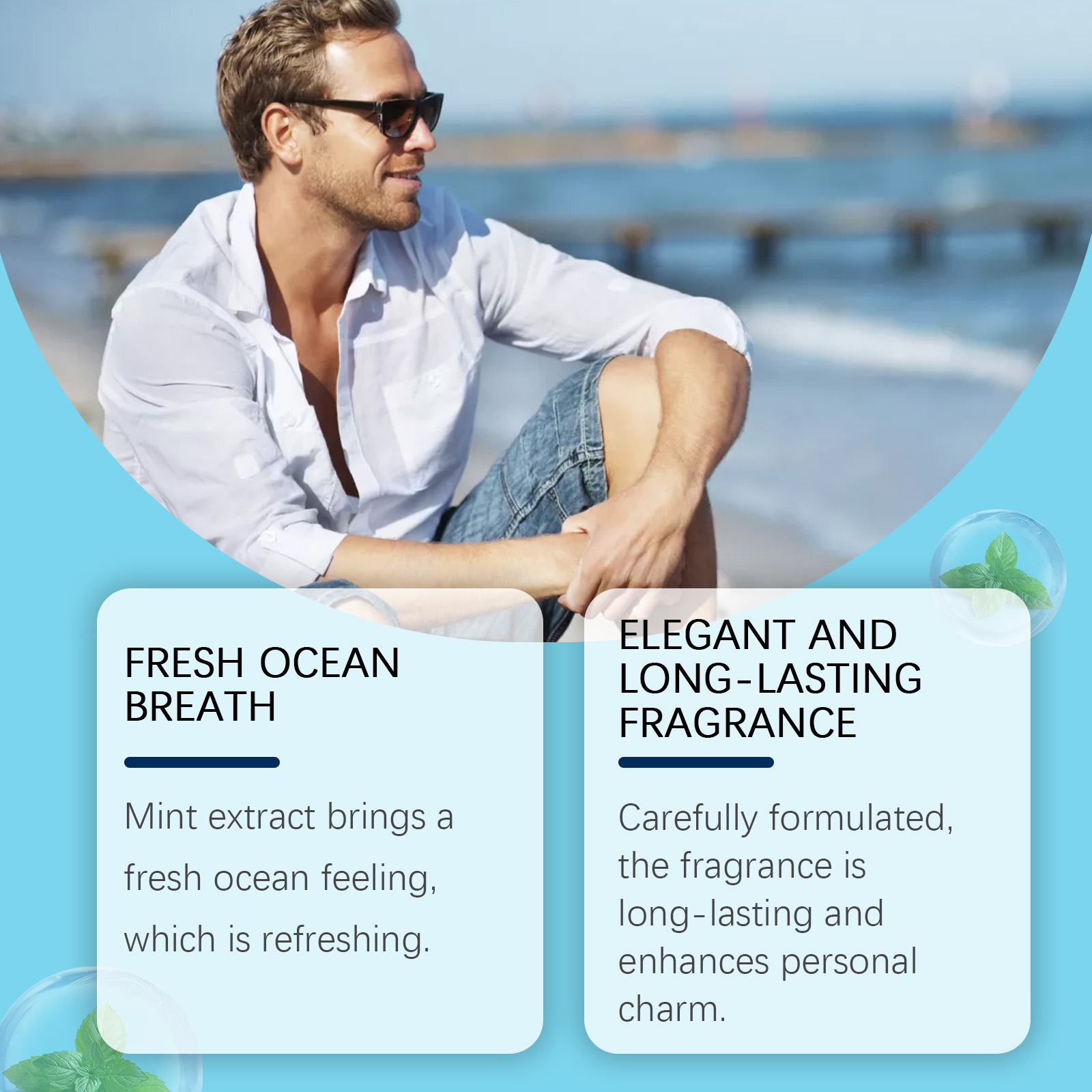 Our Ocean Fresh Luxury Eau de Toilette contains peppermint extract, cedar extract and sea salt. It can bring a fresh ocean feeling and is refreshing. Carefully formulated, lasting fragrance, enhance personal charm. Its use method is very simple: gently spray the perfume on the wrist, neck, behind the ears and other pulse points, each spray 1-2 times, to achieve the best perfume distribution effect. And suitable for all skin types, mild, non-irritating, safe to use. The aromas are richly layered, combining the refreshing scent of mint and the unique aroma of sea salt to create a unique atmosphere.