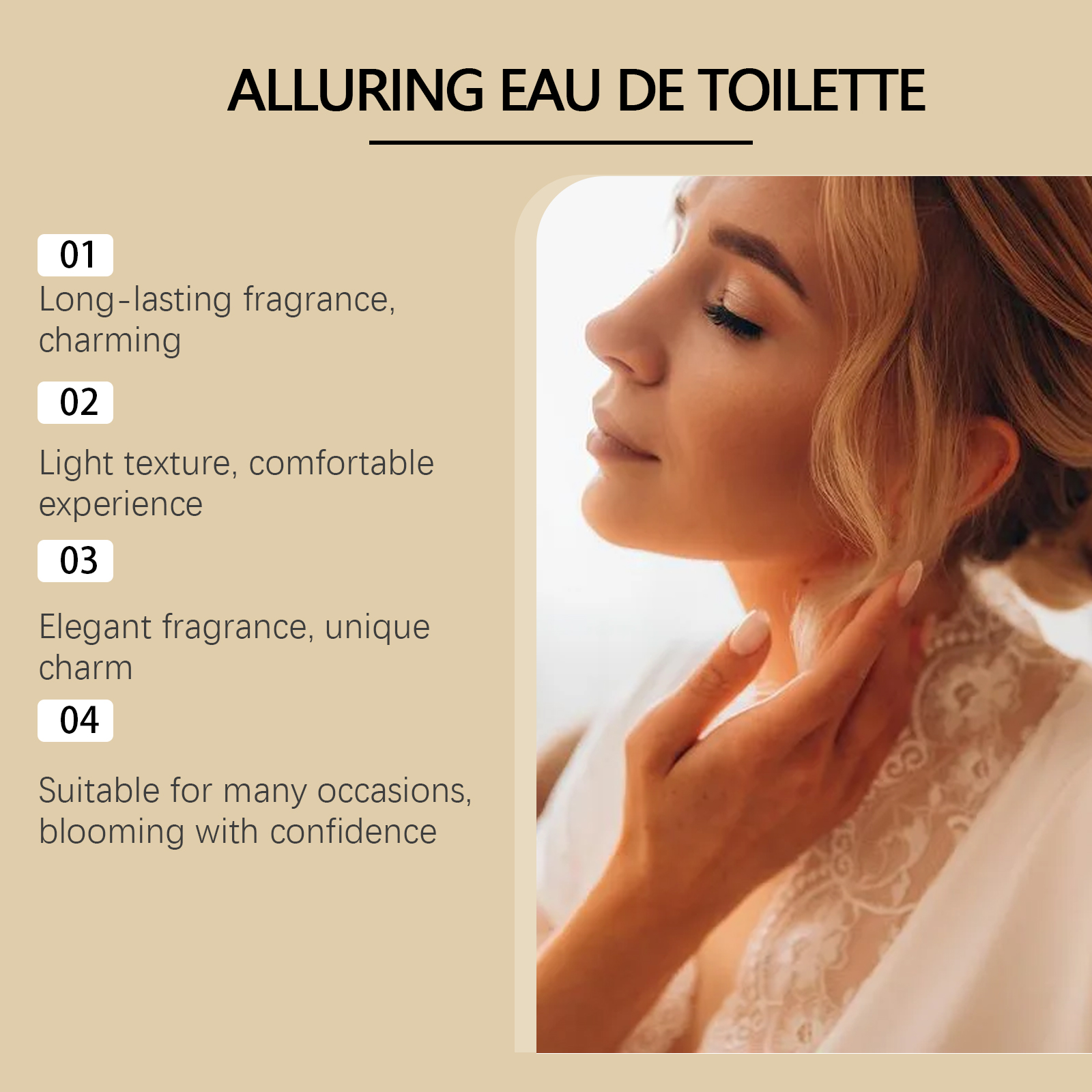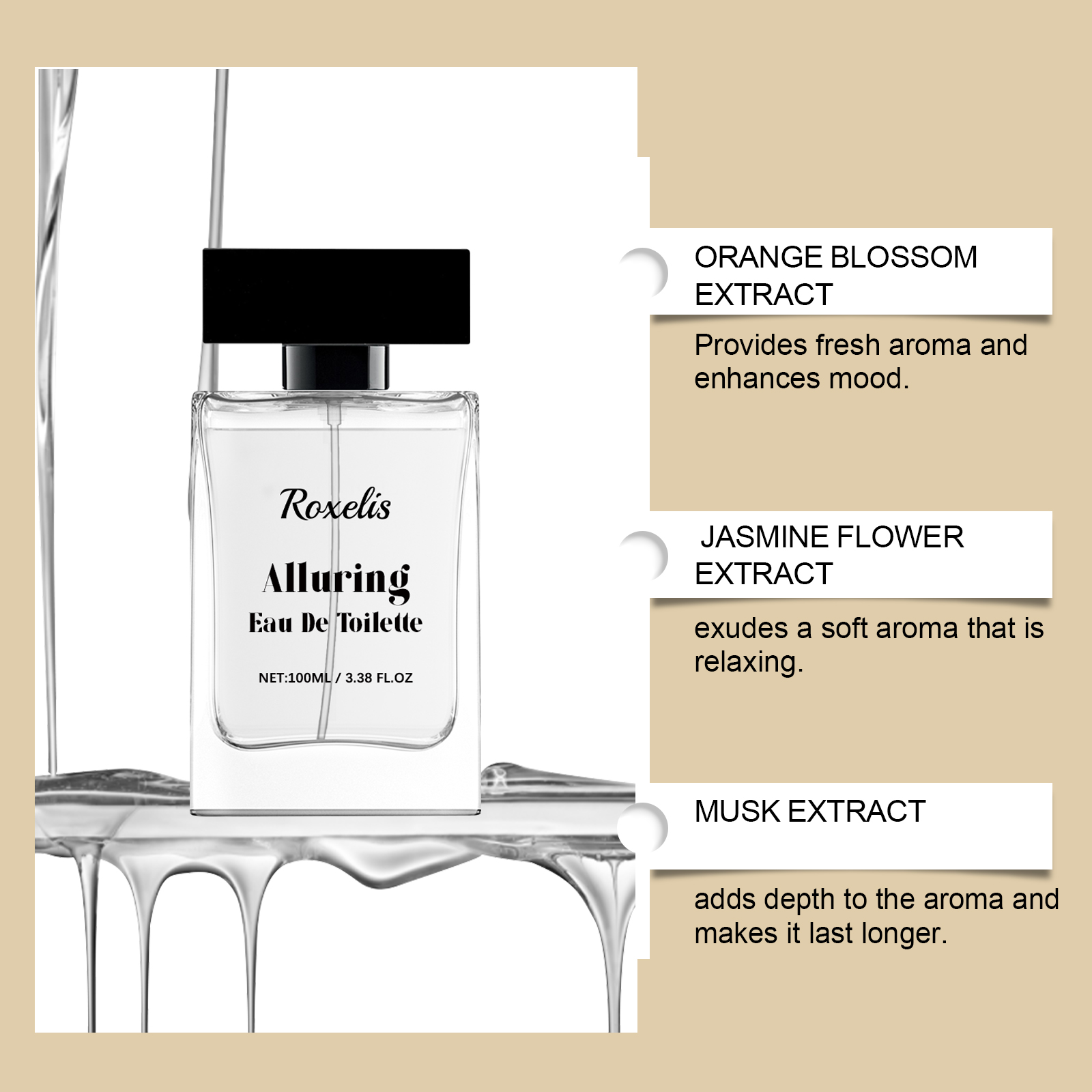Our pure musk eau de Toilette contains musk extract and patchouli leaf extract, which enhances personal appeal. Its use method is very simple: gently spray the perfume on the wrist neck, behind the ear and other pulse points, spray 1-2 times each time, to achieve the best perfume distribution effect. And can provide a lasting fragrance, exuding charming charm.