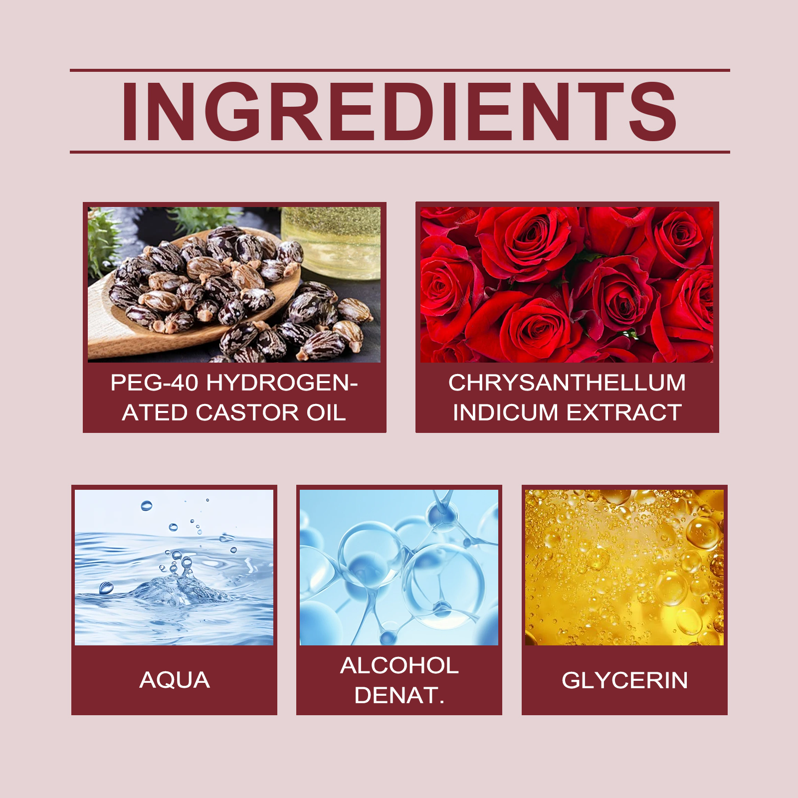 Our Rose Essential Oil fragrance water contains PEG-40 hydrogenated castor oil and glycerin. It can provide a soft floral scent and soothe the mood. Add fresh fruit and enhance the aroma. Brings unique fragrance and elegance. Its use is simple: use a massage ball to gently apply the perfume to pulse points such as behind the ears, neck, and collarbone. Use 1-2 times at a time to achieve the best diffuser effect. The perfect combination of rose extract and pineapple extract creates a fresh and pleasant aroma. The essential oil formula ensures a long-lasting scent that will keep you looking attractive all day long.