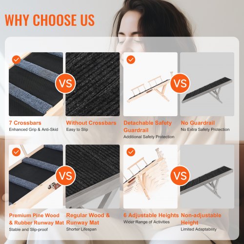 VEVOR Dog Ramp, Folding Pet Ramp for Bed, Adjustable Dog Ramp for Small, Large, Old Dogs & Cats, Wooden Pet Ramp with 47.2" Long Ramp, Adjustable from 13.8" to 27.6", Suitable for Couch, Sofa, CarSturdy SupportSuitable for Various PetsPortable & ConvenientWide ApplicationAdjustable Height47.2 inch Adjustable Pet Ramp6-level Adjustable Height: 13.8''/35cm, 17.7''/45cm, 20.3''/52cm, 22.8''/58cm, 25.6''/65cm, 27.6''/70cm,Ramp Length: 47.2 in/1200 mm,Number of Crossbars: 7,Primary Materials: Pine Wood, Rubber,Item Model Number: ATSA2025,Product Weight: 14.1 lbs/6.4 kg,Product Size: 47.2x16.5x2.4 in/1199x419x61 mm
