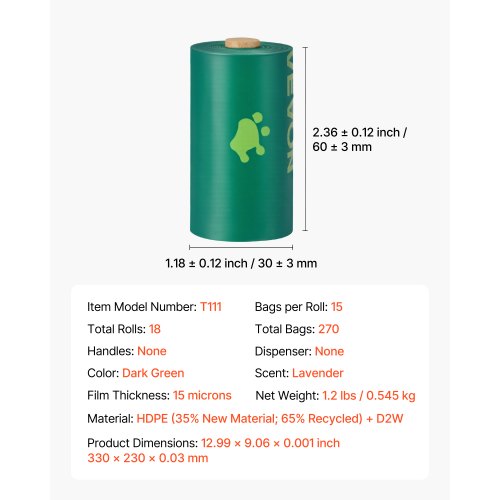 Thick Dog Poop Waste Bags Refill Rolls 270PCS Lavender Scented BiodegradableSustainable & Lavender ScentedD2W Degradation TechnologyDurable & Leak-ProofValue PackStandard Core Design:Compatible with Standard Dispensers:Total Rolls: 18,Total Bags: 270,Dispenser: None,Bags per Roll: 15,Color: Dark Green,Item Model Number: T111,Handles: None,Material: HDPE (35% New Material; 65% Recycled) + D2W,Scent: Lavender,Product Dimensions: 12.99 × 9.06 × 0.001 inch / 330 × 230 × 0.03 mm,Net Weight: 1.2 lbs / 0.545 kg,Film Thickness: 15 microns