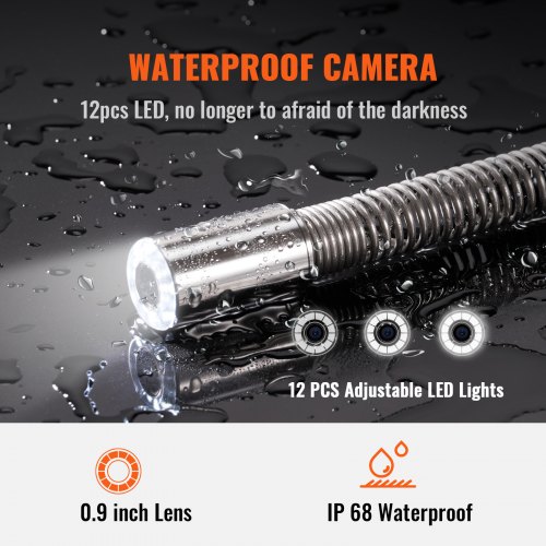 VEVOR Sewer Camera Pipe Inspection Camera 9-inch 720p Screen Pipe Camera 393 ftExcellent Camera Quality9-inch Colorful Screen393 ft Cable Length4500 mAh BatteryTwo Protective CoversSun VisorCamera LED Light: 12PCS,Camera Pixels: 1 Million,Screen Size: 9 inch,View Angle: 130 Degree,Waterproof: IP68,Camera Diameter: 0.9 in/23 mm,LED Adjustable: Yes,Battery Work Time: 6h,Storage: 16 GB SD Card,Battery Capacity: 4500 mAh,Cable Length: 393 ft/120 m,Camera Length: 5.6 in/143 mm,Camera Material: 303 Stainless Steel