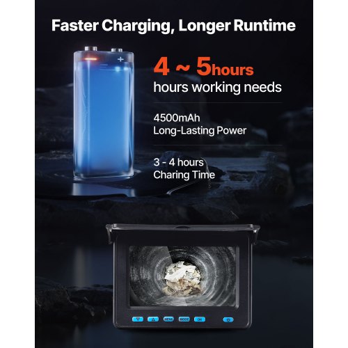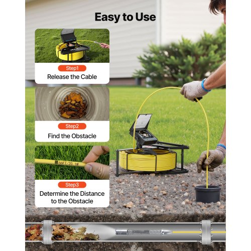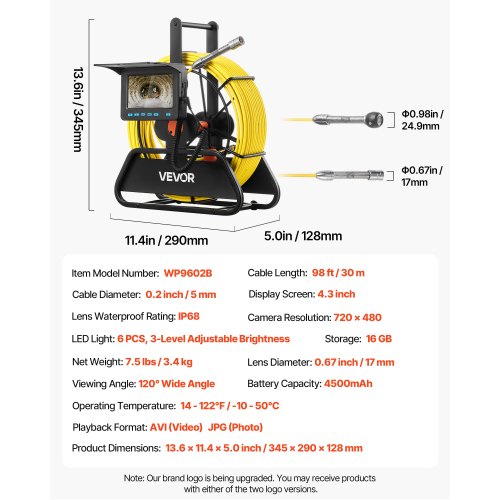 VEVOR Sewer Camera 98ft 4.3-inch Drain Inspection Camera IP68 Waterproof 6 LEDS<br/>Adjustable Brightness<br/>4.3-Inch Color Display<br/>Robust Cable<br/>IP68 Waterproof<br/>Versatile Applications<br/>Convenient Cable Reel<br/>Lens Waterproof Rating: IP68,Operating Temperature: 14 - 122 ℉ / -10 - 50 ℃,LED Light: 6 PCS, 3-Level Adjustable Brightness,Display Screen: 4.3 inch,Viewing Angle: 120° Wide Angle,Product Dimensions: 13.6 x 11.4 x 5.0 inch / 345 x 290 x 128 mm,Lens Diameter: 0.67 inch / 17 mm,Battery Capacity: 4500 mAh,Storage: 16 GB,Item Model Number: WP9602B,Cable Diameter: 0.2 inch / 5 mm,Cable Length: 98 ft / 30 m,Playback Format: AVI (Video), JPG (Photo),Net Weight: 7.5 lbs / 3.4 kg