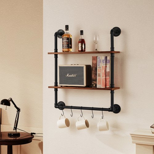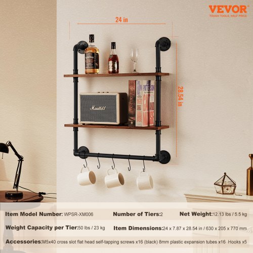VEVOR Industrial Pipe Shelf 2 Tier 24x7.87in Wall-Mount for Kitchen BedroomRustproof and durableEasy to clean and maintainMulti-functional ToolEasy InstallationSuitable for many wall surfacesEasy to assembleSuspension rod: Yes,Inside width: 505mm,Plank length, width and thickness: 610±5 x 200±5 x 15±2,Color wood board: vintage color round tube: black,Specification: 4 x 7.87 x 28.54in (610 x 200 x 725mm, tolerance ±5mm),Weight Capacity per Tier: 50 lbs / 23 kg,Number of Tiers: 2,Layer height: 300mm,Item Model Number: WPSR-XM006,Item Dimensions: 24 x 7.87 x 28.54 in / 630 x 205 x 770 mm,Main material: board: P2 grade density board, round tube: galvanized tube,Round tube specification: ∅25±1 x 1.2±0.1mm,Net Weight: 12.13 lbs / 5.5 kg