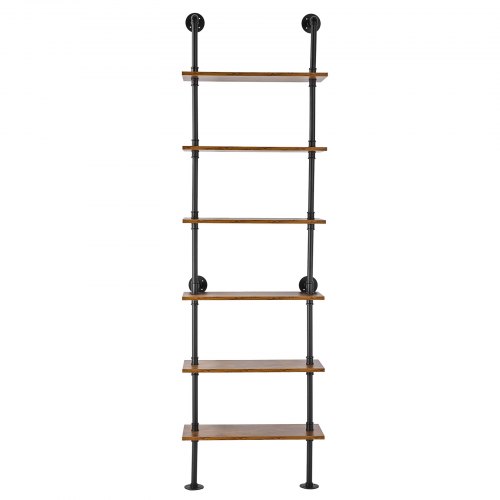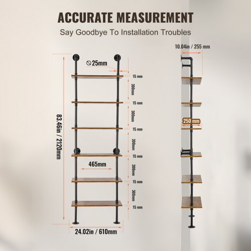 VEVOR Industrial Pipe Shelf 6 Tier 24x9.84in Wall-Mount for Kitchen BedroomRustproof and durableEasy to clean and maintainMulti-functional ToolEasy InstallationSuitable for many wall surfacesEasy to assembleSuspension rod: no,Round tube size: ∅25±1 x 1.2±0.1mm,Number of layers: 6,Color wood board: vintage color round tube: black,Specification: 24 x 9.84 x 82.68in (610±5 x 250±5 x 2100±10mm),Board size: 610±5 x 250±5 x 15±2 mm,Layer height: 300mm,Item Model Number: WPSR-XM014,Load capacity per layer: 50lbs / 23kg,Item Dimensions: 24.02 x 10.04 x 83.46 in / 610 x 255 x 2120 mm,Net Weight: 33.73 lbs / 15.3 kg,Main Material: P2 density board ,Steel (galvanized),Inner width: 465mm
