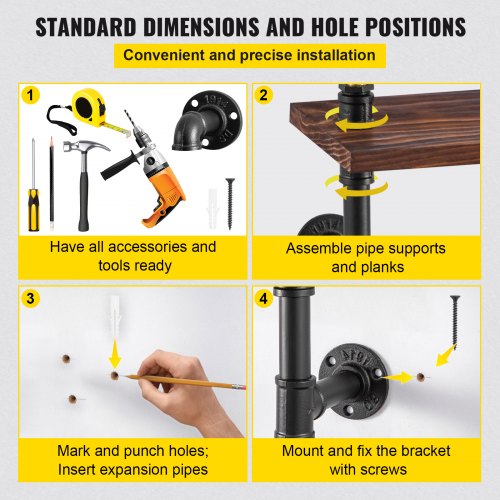 VEVOR Industrial Pipe Shelving, Pipe Shelves with 4-Tier Wood Planks, Rustic Floating Shelves Wall Mounted, Wall Shelf DIY Bookshelf for Bar Kitchen Bathroom Farmhouse Living Room, 51x25x9 inchRetro Rustic DesignDIY Versatile Pipe ShelvesMetal ConstructionHigh-Quality Solid WoodEasy to InstallWidely UsedPlank Size A: 17.72x7.87 in / 45x20 cm,Plank Size B: 13.78x7.87 in / 35x20 cm,Item Size: 51.18x8.66x24.8 in / 130 x 22 x 63 cm,Color: Black,Layers of Planks: 4,Pipe Diameter: 1 in / 25 mm,Model: VV-GSCWJ-002,Material: Steel, Solid Wood,Package Weight: 15.32 lbs / 7 kg,Board Thickness: 0.8 in / 20 mm
