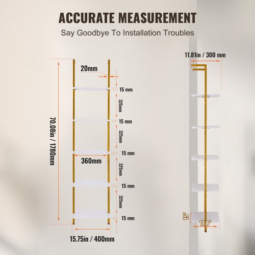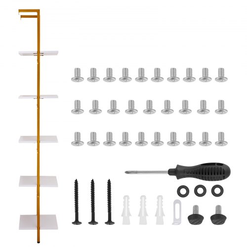 VEVOR Industrial Square Pipe Shelf 5 Tier 15.6x11.8in Wall-Mount Gold WhiteRustproof and durableEasy to clean and maintainMulti-functional ToolEasy InstallationSuitable for many wall surfacesEasy to assembleInside width: 360mm,Number of layers: 5,Color: Plank: white Square tube: gold,Square tube specification(section): 20±1 x 20±1 x 0.7±0.1mm,Specification: 15.7 x 11.8 x 70in (400±5 x 300±5 x 1780±10mm),Foot: Including adjustable feet,Board (mm):400±5 x 300±5 x 15±2,Layer height: 325mm,Item Model Number: C240256S-02,Load capacity per layer: 50lbs / 23kg,Item Dimensions: 15.75 x 11.81 x 70.08 in / 400 x 300 x 1780 mm,Net Weight: 18.52 lbs / 8.4 kg,Main Material: Wooden board: 15mm P2 grade particle board, Square tube: Steel
