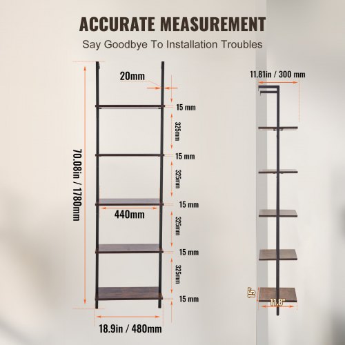 VEVOR Industrial Square Pipe Shelf 5 Tier 17.3x11.8in Wall-Mount for BedroomRustproof and durableEasy to clean and maintainMulti-functional ToolEasy InstallationSuitable for many wall surfacesEasy to assembleInside width: 440mm,Number of layers: 5,Color: Plank: vintage Square tube: black,Plank(mm): 480±5 x 300±5 x 15±2,Specification: 18.9 x 11.8 x 70in (480 x 300 x 1780mm),Foot: Including adjustable feet,Square tube specification: 20±1 x 20±1 x 0.7±0.1mm,Layer height: 325mm,Item Model Number: C240257S-01,Load capacity per layer: 50lbs / 23kg,Item Dimensions: 18.9 x 11.81 x 70.08 in / 480 x 300 x 1780 mm,Main material: board: 15mm P2 grade particle board, square tube: Q195,Net Weight: 21.83 lbs / 9.9 kg