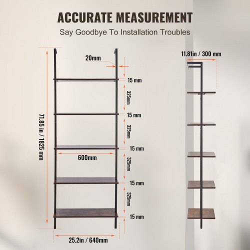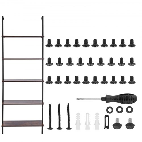 VEVOR Industrial Square Pipe Shelf 5 Tier 24x11.8in Wall-Mount for BedroomRustproof and durableEasy to clean and maintainMulti-functional ToolEasy InstallationSuitable for many wall surfacesEasy to assembleInside width: 600mm,Number of layers: 5,Color: Plank: vintage Square tube: black,Plank(mm): 640±5 x 300±5 x 15±2,Specification: 25.2 x 11.8 x 71.9in (640 x 300 x 1825mm,),Foot: Including adjustable feet,Square tube specification: 20±1 x 20±1 x 0.7±0.1mm,Layer height: 320mm,Item Model Number: C240258S-01,Load capacity per layer: 50lbs / 23kg,Item Dimensions: 25.2 x 11.81 x 71.85 in / 640 x 300 x 1825 mm,Main material: board: 15mm P2 grade particle board, square tube: Q195,Net Weight: 27.56 lbs / 12.5 kg