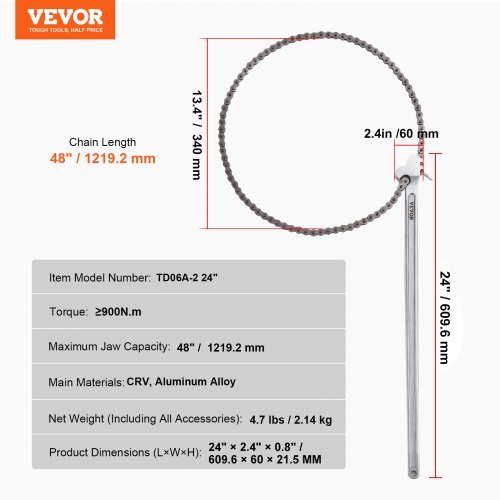 VEVOR Chain Wrench, 48 inch Chain Pipe Wrench, 13.4 inch Diameter Capacity, CRV Reversible Pipe Fitting Tool Wrench with High Strength Jaw and Ergonomic Handle, for Pipe Installation and Car RepairSuitable for Complex EnvironmentsSturdy and DurableComfortable GripBidirectional OperationWide ApplicationConcave Tooth DesignHandle Length: 24" / 609.6 mm,Net Weight (Including All Accessories): 4.7 lbs / 2.14 kg,Torque: ≥900N.m,Main Materials: CRV, Aluminum Alloy,Item Model Number: TD06A-2 24",Chain Length: 48" / 1219.2 mm