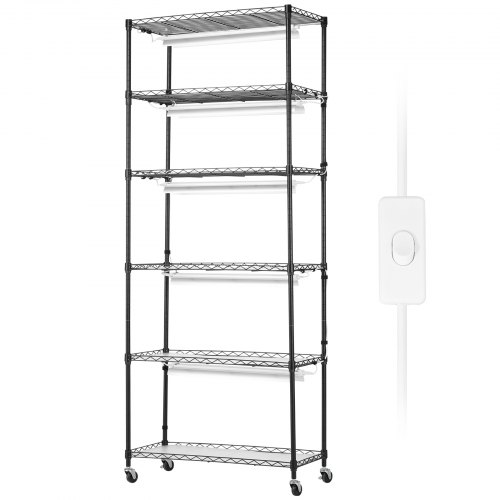 VEVOR DIY Plant Stand with Grow Light, 6-Tier Large Tall Plant Shelf with 192W 5000K Full Spectrum Grow Lights, Indoor Grow Light Shelf with Wheels for Seed Starting 29.5" L x 13.8" W x 70.9" HPlant Stand with Grow LightElectronic TimerGrow Light ParametersEasy InstallationConvenient & Secure DesignSecurity FeaturesNumber of Grow Lights: 8,Weight Capacity: 270 lbs,Single Light Power: 24W,Color: Black,Total Power: 192W,Item Model Number: 6C18075-T8DP06P8-US,Product Weight: 33.9 lbs / 15.4 kg,Product Dimensions: 29.53 x 13.8 x 70.87 in / 750 x 350 x 1800 mm,Main Material: Iron Q235 Paint