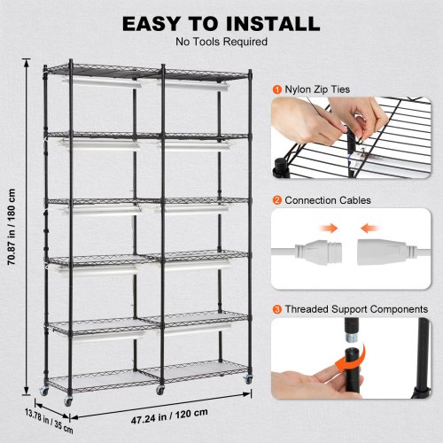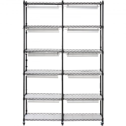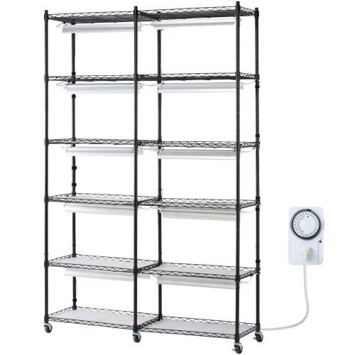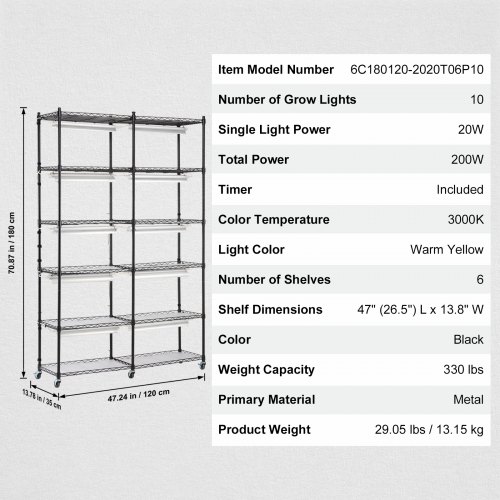 VEVOR Plant Stand with Grow Light, 6-Tier Large Tall Plant Shelf with 3000K 200W Full Spectrum Grow Light, Indoor Grow Light Shelf with Timer and Wheel for Seed Starting 47.2" L x 13.8" W x 70.8" HPlant Stand with Grow LightMechanical TimerGrow Light ParametersConvenient & Secure DesignEasy InstallationSecurity FeaturesPrimary Material: Iron Q235 Paint,Number of Grow Lights: 10,Weight Capacity: 330 lbs,Single Light Power: 20W,Color: Black,Total Power: 200W,Item Model Number: 6C180120-2020T06P10-US,Product Weight: 29.05 lbs / 13.15 kg,Product Dimensions: 35.43 x 13.78 x 59.06 in / 900 x 350 x 1500 mm