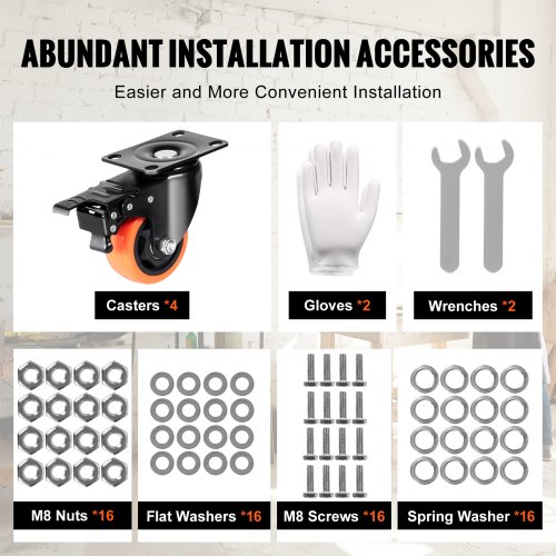 VEVOR Caster Wheels, 3-inch Swivel Plate Casters, Set of 4, with Security A/B Locking No Noise PVC Wheels, Heavy Duty 250 lbs Load Capacity Per Caster, Non-Marking Wheels for Cart Furniture WorkbenchSilent Dual Ball BearingsFreedom to Spin, Any DirectionBuilt to LastRich in AccessoriesVersatility at Its BestFloor-Friendly WheelsInstallation Height: 4.13 in/105 mm,Item Model Number: CC-PBJL-3,Product Weight: 7.16 lbs/3.25 kg,Max Load Capacity: 250 lbs/113 kg (per wheel),Wheel Diameter: 3 in/76.2 mm,Number of Wheels: 4,Wheel Width: 1.25 in/32 mm,Wheel Material: PVC,Product Size: 6.10x2.51x4.13 in/155x64x105 mm,Wheel Axle Diameter: 0.39 in/10 mm