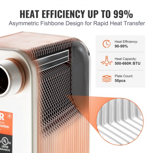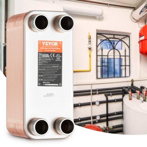 VEVOR Heat Exchanger, 5"x 12" 50 Plates Brazed Plate Heat Exchanger, Copper/316L Stainless Steel Water To Water Heat Exchanger For Floor Heating, Water Heating, Snow Melting, Beer CoolingThickened InterfaceHigh Efficiency and Energy SavingDual UseMultiple Sizes AvailableHigh CompatibilitySecure to UsePlate Area: 5x12 inch/ 127x305mm,Heat Capacity: 500-660K BTU,Port: 4*1-1/4" MNPT External Thread,Color: Stainless Steel + Copper Color,Model: EATB28-50,Thermal Efficiency: 90~99%,Material: 304/316 Stainless Steel, Solder: 99.9% Copper Brazing,Plates Quantity(pcs): 50,Product Dimensions (L x W x H): 11.85x4.96x6.18" / 301x126x157 mm,Net Weight (with Accessories): 18.78lb / 8.52kg