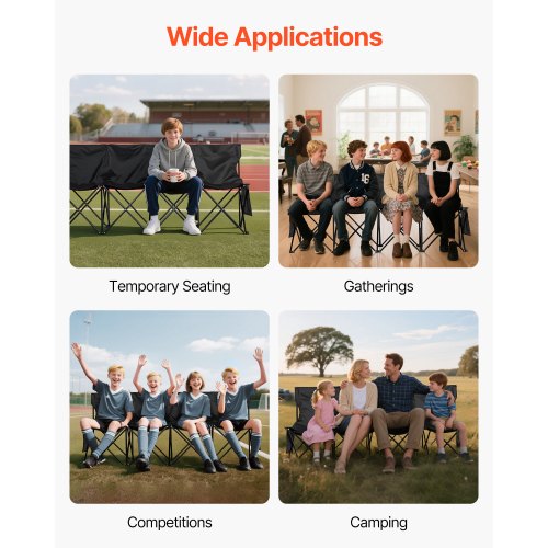VEVOR Folding Chair Sports 4 Seat Sideline Team Bench with Sidebag & Carry Bag<br/>Easy Item Storage<br/>600D Oxford Fabric<br/>Includes Carry Bag<br/>Easy to Fold and Move<br/>Suitable for Various Scenarios<br/>Multiple Options<br/>Color: Black,Item Model Number: GV-DR4B,Material: 600D Oxford Fabric + Round Iron Tubes,Item Dimensions: 63.0 x 17.0 x 32.3 inch / 1610 x 450 x 820 mm,Net Weight: 13.2 lbs / 6.0 kg