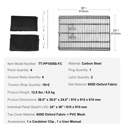 Dog Playpen 4 Panels Foldable Metal Dog Exercise Pen with Bottom Pad CoverMetal Playpen with Ground MatIdeal for Small PetsDurable Ground Mat and Top CoverMulti-Layered Escape Prevention DesignPortable and Foldable PlaypenHigh-Density Sturdy MeshLatch Quantity: 2,Panel Quantity: 4,Top Cover Material: 600D Oxford Fabric + PVC Mesh,Item Model Number: TT-PP1005S-FC,Product Weight: 12.8 lbs / 5.8 kg,Material: Carbon Steel,Plug Quantity: 1,Tension Strap Quantity: 16+2,Product Dimensions: 36.0" x 36.0" x 24.0" / 910 x 910 x 610 mm,Individual Panel Size (H x W): 24" x 36" / 610 x 910 mm,Ground Stake Quantity: 4,Mat Material: 600D Oxford Fabric