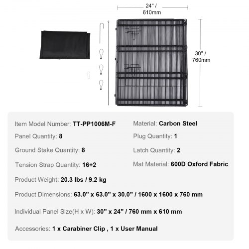 Dog Playpen 8 Panels Foldable Metal Dog Exercise Pen with Bottom Pad 30"HMetal Playpen with Ground MatIdeal for Small PetsSturdy Waterproof Ground MatMulti-Layered Escape Prevention DesignPortable and Foldable PlaypenHigh-Density Sturdy MeshLatch Quantity: 2,Panel Quantity: 8,Item Model Number: TT-PP1006M-F,Product Weight: 20.3 lbs / 9.2 kg,Material: Carbon Steel,Plug Quantity: 1,Tension Strap Quantity: 16+2,Product Dimensions: 63.0" x 63.0" x 30.0" / 1600 x 1600 x 760 mm,Individual Panel Size (H x W): 30" x 24" / 760 mm x 610 mm,Ground Stake Quantity: 8,Mat Material: 600D Oxford Fabric