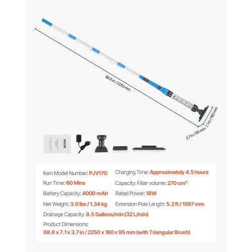 VEVOR Pool Vacuum, 8.5 GPM Handheld Cordless Hot Tub Vacuum with Extension Pole, for Deep Cleaning & Strong Suction, Rechargeable Pool Cleaner, Running up to 1Hour, for Above Ground/Inground Pool SpasCordless Pool Vacuum CleanerRechargeable & CordlessVersatile CleaningAdjustable LengthComplete Accessories SetQuick AssemblyExtension Pole Length(Total): 5.2 ft / 1597 mm,Battery Capacity: 4000 mAh,Capacity: Filter Volume: 270 cm³,Drainage Capacity: 8.5 Gallons/min (32 L/min),Item Model Number: PJV17G,Rated Power: 18W,Run Time: 60 Mins,Product Dimensions: 88.6 x 7.1 x 3.7 in / 2250 x 180 x 95 mm (with Triangular Brush),Charging Time: Approximately 4.5 hours,Net Weight: 3.0 lbs / 1.34 kg