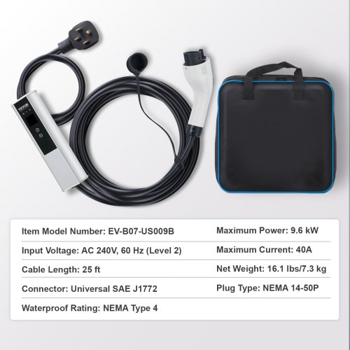 VEVOR Level 2 Portable EV Charger, 40A 240V, Electric Vehicle Charger with 25 ft Charging Cable NEMA 14-50P Plug, 40A/32A/24A/16A Adjustable Current Plug-in Home EV Charging Station for SAE J1772 EVsAdjustable Current100% Copper Wire TPE CableStrong Weather ResistanceAll-Round ProtectionVersatility at Its BestUniversal CompatibilityConnector: Universal SAE J1772,Waterproof Rating: NEMA Type 4,Maximum Power: 9.6 kW,Plug Type: NEMA 14-50P,Maximum Current: 40A,Item Model Number: EV-B07-US009B,Input Voltage: AC 240V, 60 Hz (Level 2),Cable Length: 25 ft,Net Weight: 16.1 lbs/7.3 kg