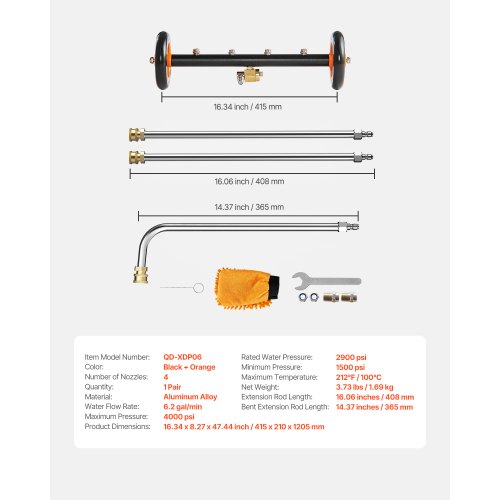 16" Pressure Washer Undercarriage Cleaner with 2 Wheels 2 Extended Wands16 in Stainless Steel Extension Rod14 in Stainless Steel Elbow Extension Rod1/4 Quick-Connect FittingEasy SetupHigh QualityTime-Saving and EffortlessNumber of Nozzles: 4,Color: Black + Orange,Material: Aluminum Alloy,Product Dimensions: 16.34 x 8.27 x 47.44 inch / 415 x 210 x 1205 mm,Maximum Temperature: 212℉ / 100℃,Extension Rod Length: 16.06 inches / 408 mm,Bent Extension Rod Length: 14.37 inches / 365 mm,Water Flow Rate: 6.2 gal/min,Item Model Number: QD-QXQ01,Minimum Pressure: 1500 psi,Net Weight: 3.73 lbs / 1.69 kg,Maximum Pressure: 4000 psi,Rated Water Pressure: 2900 psi
