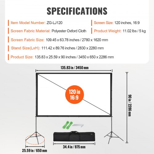 VEVOR Projector Screen with Stand, 120 inch 16:9 4K 1080 HD Outdoor Movie Screen with Stand, Wrinkle-Free Projection Screen with Tripods and Carry Bag, for Home Theater Cinema Backyard Movie NightWrinkle-Free MaterialExpansive Viewing AngleStable StandQuick AssemblyLightweight PortabilityDetailed Image QualityScreen Size: 120 inches, 16:9,Item Model Number: ZG-LJ120,Product Weight: 11.02 lbs / 5 kg,Screen Fabric Size: 109.45 x 63.78 inches / 2780 x 1620 mm,Stand Size(LxH): 111.42 x 89.76 inches / 2830 x 2280 mm,Screen Fabric Material: Polyester Oxford Cloth,Product Size: 135.83 x 25.59 x 90 inches / 3450 x 650 x 2286 mm