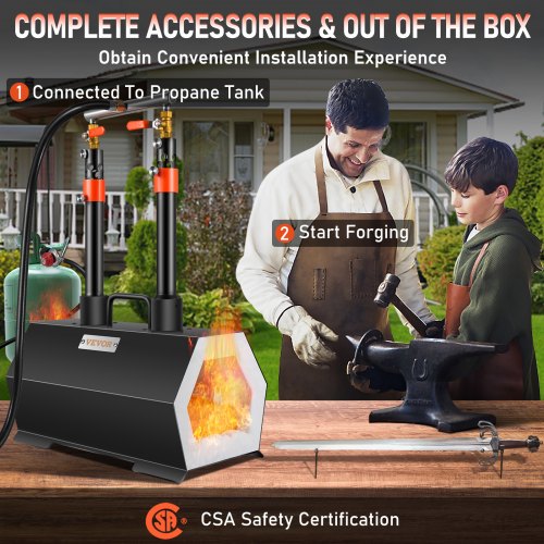 VEVOR Propane Forge Portable, Double Burner Tool and Knife Making, Large Capacity Blacksmith Farrier Forges, Mini Furnace Blacksmithing, Gas Forging Tools and Equipment, Complete KitWorks On Most MetalsDesigned to be the BestHigh Strength BurnerEasy & Quick InstallationReliable Pressure Comparison TablePerfect For Different Forging ScenesThread Specification of Regulating Valve: 1.3125" ACME QCC1,Shape: Hexagon,Item Dimension(LxWxH): 15.7 x 8.5 x 7.5 inch /400 x 215 x 190 mm,Thick of Refractory Ceramic Fiber: 1.2(±0.1)inch /30(±3)mm,Model: JHLJS02A,Thick of Refractory Fire Brick: 1.2(±0.1)inch /30(±2)mm,Item Weight: 22.9 lbs / 10.4 kg,Standard Number of Regulating Valve: CGA 510,Type of Regulating Valve: A