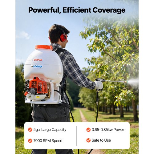 VEVOR Gas Powered Backpack Sprayer 26.5CC 0.9HP Engine 5 Gallon Garden Sprayer<br/>Wide Mouth Lid<br/>Covers More Ground<br/>Includes Gloves & Ear Protection<br/>Multi-Purpose Use<br/>Long Reach & Easy Handling<br/>Versatile Use<br/>Ignition Method: Electronic Ignition,Item Dimensions (LxWxH): 17.13 × 14.76 × 23.82 in / 435 × 375 × 605 mm,Color: White + Orange,Powder Tank: Not Included,Fuel Type: 92# gasoline or equivalent ethanol gasoline (ethanol content ≤10%) mixed with 2-stroke engine oil (JASO-FC grade or above), 50:1 volume ratio,Tank Capacity: 5 gal / 19 L,Engine Speed: 7000 r/min ±10%,Item Model Number: 3WZ-9,Tank Material: HDPE,Net Weight: 10 kg / 22.05 lb,Power: 0.65–0.85 kW,Start Method: Recoil Start,Main Material: Plastic + Metal