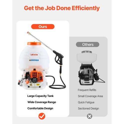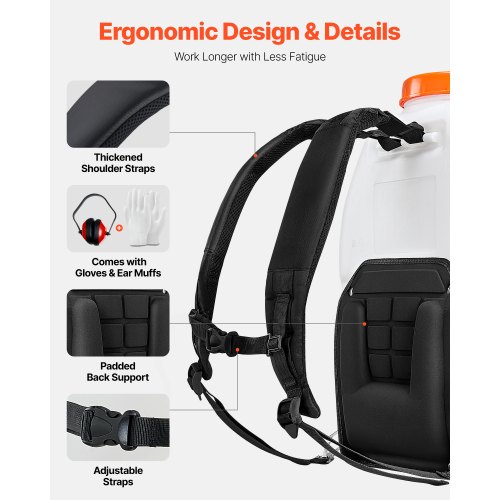 VEVOR Gas Powered Backpack Sprayer 26.5CC 0.9HP Engine 5 Gallon Garden Sprayer<br/>Wide Mouth Lid<br/>Covers More Ground<br/>Includes Gloves & Ear Protection<br/>Multi-Purpose Use<br/>Long Reach & Easy Handling<br/>Versatile Use<br/>Ignition Method: Electronic Ignition,Item Dimensions (LxWxH): 17.13 × 14.76 × 23.82 in / 435 × 375 × 605 mm,Color: White + Orange,Powder Tank: Not Included,Fuel Type: 92# gasoline or equivalent ethanol gasoline (ethanol content ≤10%) mixed with 2-stroke engine oil (JASO-FC grade or above), 50:1 volume ratio,Tank Capacity: 5 gal / 19 L,Engine Speed: 7000 r/min ±10%,Item Model Number: 3WZ-9,Tank Material: HDPE,Net Weight: 10 kg / 22.05 lb,Power: 0.65–0.85 kW,Start Method: Recoil Start,Main Material: Plastic + Metal