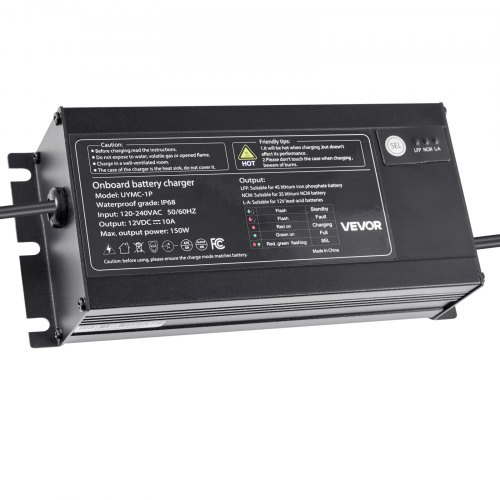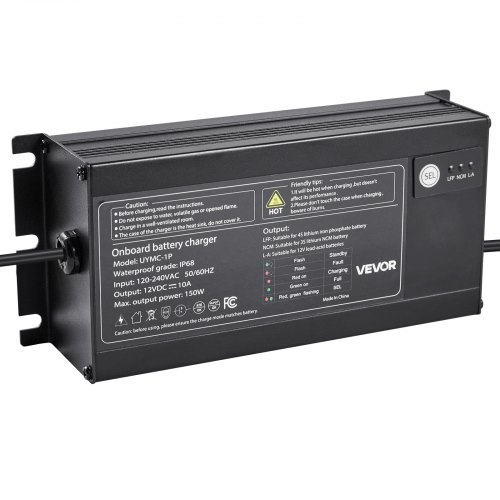 1-Bank 10A 12V Smart Marine Battery Charger Onboard IP68 Waterproof Boat RVStable Power SupplyRecharge Depleted BatteriesCharging Security SystemThree-Stage Charging ModeWide ApplicationMetal MaterialOperating Temperature: -4℉ to 185℉/-20°C to 85°C,Mounting Hole Distance: 7.8 in/197 mm,Output Current: 10A,Compatible Batteries: Lead-Acid Battery/Lithium-Ion Battery,Product Dimensions: 8.3 x 3.54 x 2.1 in/210 x 90 x 53 mm,Input Voltage / Frequency: 120-240V AC, 50/60Hz,Water Resistance Rating: IP68,DC Cable: 5.74 ft/1.75 m,Item Model Number: UYMC-1P,Maximum Output Power: 150W,AC Cable: 5.74 ft/1.75 m,Number of Output Banks: 1,Output Voltage: 12V DC,Net Weight: 3.75 lbs/1.7 kg,Main Material: Aluminum Alloy