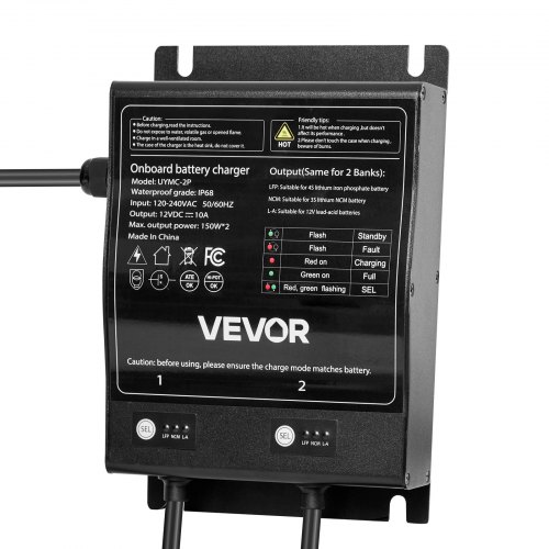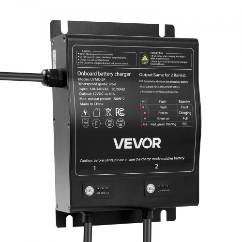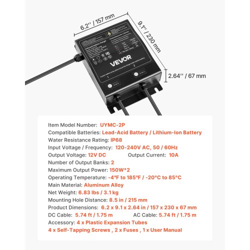 2-Bank 10A 12V Smart Marine Battery Charger Onboard IP68 Waterproof Boat RVStable Power SupplyRecharge Depleted BatteriesCharging Security SystemThree-Stage Charging ModeWide ApplicationMetal MaterialOperating Temperature: -4℉ to 185℉/-20°C to 85°C,Mounting Hole Distance: 8.5 in/215 mm,Output Current: 10A,Compatible Batteries: Lead-Acid Battery/Lithium-Ion Battery,Product Dimensions: 6.2 x 9.1 x 2.64 in/157 x 230 x 67 mm,Input Voltage / Frequency: 120-240V AC, 50/60Hz,Water Resistance Rating: IP68,DC Cable: 5.74 ft/1.75 m,Item Model Number: UYMC-2P,Maximum Output Power: 150W*2,AC Cable: 5.74 ft/1.75 m,Number of Output Banks: 2,Output Voltage: 12V DC,Net Weight: 6.83 lbs/3.1 kg,Main Material: Aluminum Alloy