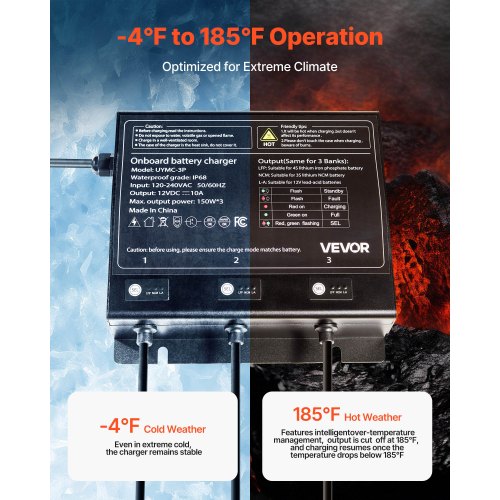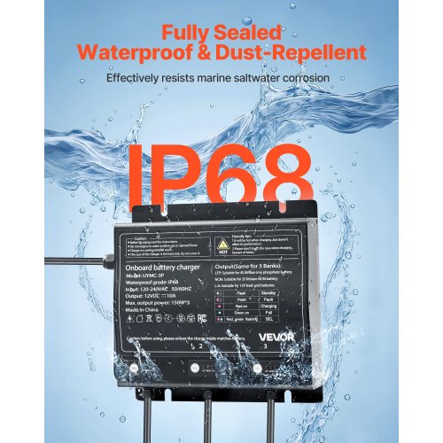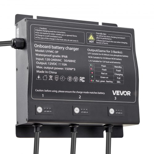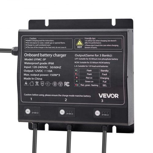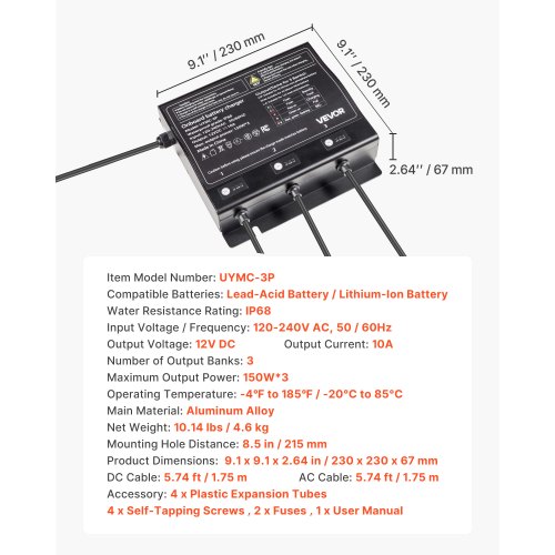 3-Bank 10A 12V Smart Marine Battery Charger Onboard IP68 Waterproof Boat RVStable Power SupplyRecharge Depleted BatteriesCharging Security SystemThree-Stage Charging ModeWide ApplicationMetal MaterialOperating Temperature: -4℉ to 185℉/-20°C to 85°C,Mounting Hole Distance: 8.5 in/215 mm,Output Current: 10A,Compatible Batteries: Lead-Acid Battery/Lithium-Ion Battery,Product Dimensions: 9.1 x 9.1 x 2.64 in/230 x 230 x 67 mm,Input Voltage / Frequency: 120-240V AC, 50/60Hz,Water Resistance Rating: IP68,DC Cable: 5.74 ft/1.75 m,Item Model Number: UYMC-3P,Maximum Output Power: 150W*3,AC Cable: 5.74 ft/1.75 m,Number of Output Banks: 3,Output Voltage: 12V DC,Net Weight: 10.14 lbs/4.6 kg,Main Material: Aluminum Alloy
