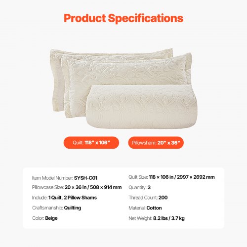 Quilt Set King Size Bedspread 1 Quilt and 2 Pillow Shams for All SeasonComfort & DurabilitySoft and Gentle TouchLong-Lasting WarmthYear-Round ComfortEasy Care and MaintenanceSimple & Stylish LookPillowcase Size: 20 x 36 in / 508 x 914 mm,Color: Beige,Item Model Number: SYSH-C01,Quilt Size: 118 x 106 in / 2997 x 2692 mm,Craftsmanship: Quilting,Quantity: 3,Include: 1 Quilt, 2 Pillow Shams,Material: Cotton,Net Weight: 8.16 lbs / 3.7 kg,Thread Count: 200