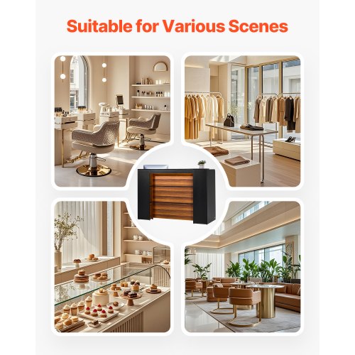 VEVOR Reception Desk, 62 Inch Rectangular Front Counter Table, Office Reception Desk Front Retail Counter with LED Light, for Checkout, Lobby, Beauty Salon and Office, Black & BrownExpand Open SpaceDurable and SturdyProfessional & Sleek DesignEasy to Clean & MaintainSimple & Quick SetupLED Strip DesignShape: Rectangular,Weight Capacity: 110.23 lbs / 50 kg,Recessed Space: 39.37 x 5.71 x 41.26 in / 1000 x 145 x 1048 mm,Color: Black + Brown,Item Model Number: SS-602,Net Weight: 112.44 lbs / 51 kg,LED Lights: Included (no remote control),Main Material: MDF,Product Size: 62.99 x 23.62 x 43.70 in / 1600 x 600 x 1110 mm