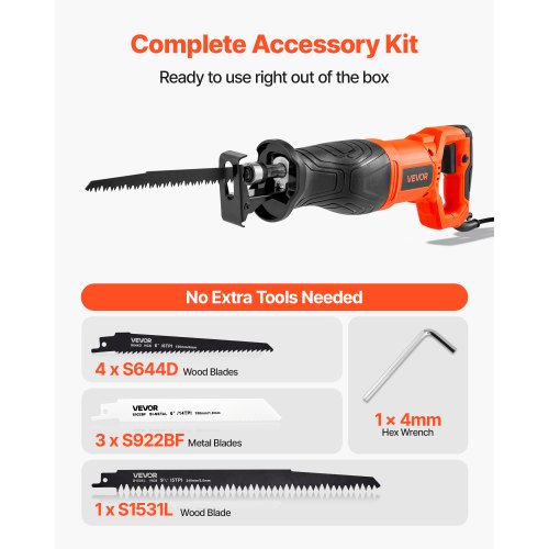 VEVOR Corded Reciprocating Saw Electric Reciprocating Saw 120V 7.5 Amp 2800 SPM<br/>Multi-Purpose Reciprocating Saw Kit<br/>Strong Power<br/>Deep-Cut Capability<br/>Built for Durability<br/>Comfortable Grip<br/>Easy to Store & Carry<br/>No-Load Power: 604W,Cutting Depth(Wood): 5.91 inch / 150 mm,Motor: Brushed,Cutting Depth(Metal): 0.315 inch / 8 mm,Housing Material: PA6-A30 + TPE,Product Size: 18.9 x 5.71 x 3.54 in / 480 x 145 x 90 mm,Gearbox Material: ZL102,Type: Corded Reciprocating Saw,Voltage: AC120 60Hz,Item Model Number: 77207,Rated Power: 900W,Stroke Length: 1-1/8 inch / 28 mm,Net Weight: 8.53 lbs / 3.87 kg,Max Speed: 2800 SPM