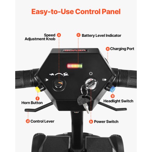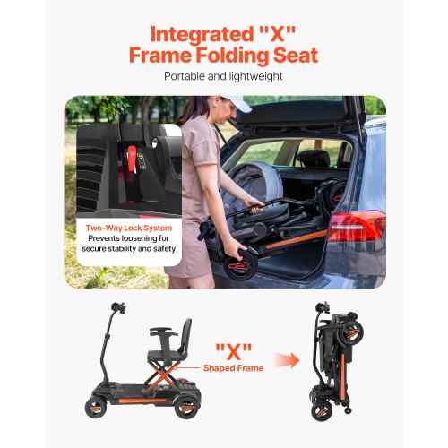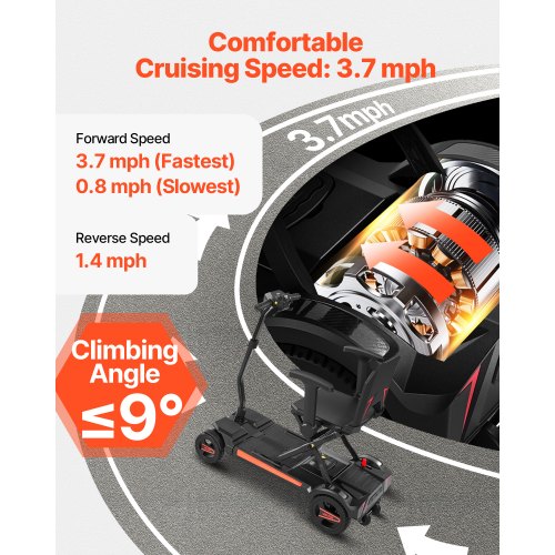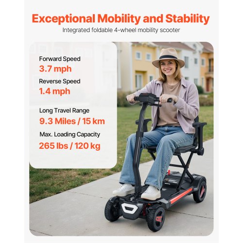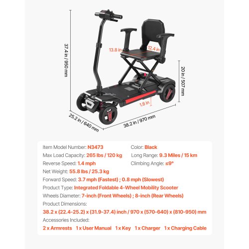 VEVOR 4-Wheel Electric Mobility Scooter Integrated Foldable Mobility Wheelchair<br/>Large Flat-Free Tires<br/>Safety Brake System<br/>Telescopic Handle<br/>Versatile Applications<br/>Go Further, Explore More<br/>High Weight Capacity<br/>Long Range: 9.3 Miles / 15 km,Reverse Speed: 1.4 mph,Climbing Angle: ≤9°,Product Type: Integrated Foldable 4-Wheel Mobility Scooter,Forward Speed: 3.7 mph (Fastest) ; 0.8 mph (Slowest),Color: Black,Item Model Number: N3473,Wheels Diameter: 7-inch (Front Wheels) ; 8-inch (Rear Wheels) ,Max Load Capacity: 265 lbs / 120 kg ,Product Dimensions: 38.2 x (22.4-25.2) x (31.9-37.4) inch / 970 x (570-640) x (810-950) mm,Net Weight: 55.8 lbs / 25.3 kg