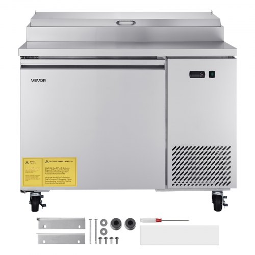 Commercial Refrigerated Pizza Prep Table Stainless Steel Fridge Single DoorStreet Mobile RestaurantPizza/Frid Chicken BarBBQ/Salad StoreDigital Temp ControlSelf-Closing DoorWide applicationClimate Type: N,Compressor Brand: Cubigel,Dimensions (L x W x H): 44 x 35.8 x 42.5 inch/1117 x 908 x 1080 mm (with cutting board installed),Product Size (L x W x H): 44 x 32.3 x 42.5 inch/1117 x 820 x 1080 mm,Refrigerant: R290,Rated Power/Current: ≤ 270W/3.0A,Item Model Number: TPP44,Material: Stainless Steel,Net Weight: 185.2 lbs/84 kg,Storage Temperature: ﹣11℉ ~ 14 ℉/-10℃ ~ -22℃,Pan Material: Food-Grade PC