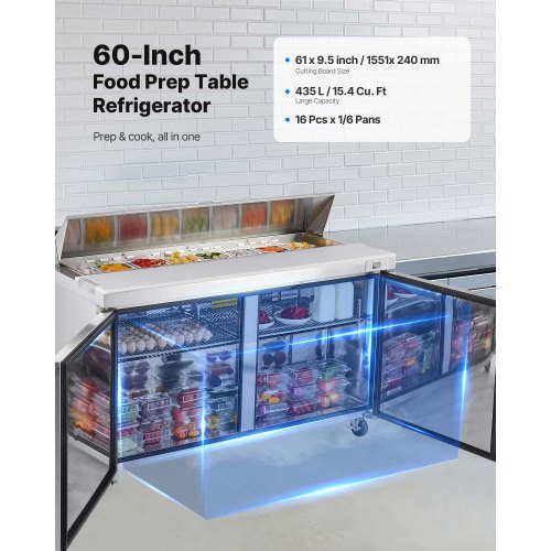 Commercial Sandwich Prep Table Refrigerator Double Door Stainless SteelMobile RestaurantsCafés & BakeriesSalad/Sandwich ShopsDigital Temp ControlSelf-Closing DoorWide applicationClimate Type: N,Compressor Brand: Cubigel,Dimensions (L x W x H): 61 x 31.5 x 45 inch/1555 x 799 x 1144 mm (with cutting board installed),Product Size (L x W x H): 61 x 30.31 x 45 inch/1555 x 770 x 1144 mm,Refrigerant: R290,Rated Power/Current: ≤ 300W/3.5A,Item Model Number: TSSP60,Pan Capacity: 16 Pcs x 1/6 Pans,Material: Stainless Steel,Net Weight: 271 lbs/123 kg,Storage Temperature: 33 ~ 41℉/2 ~ 8℃,Pan Material: Food-Grade PC