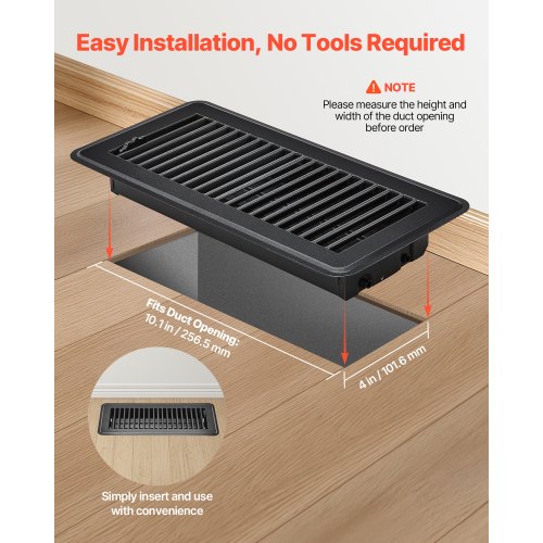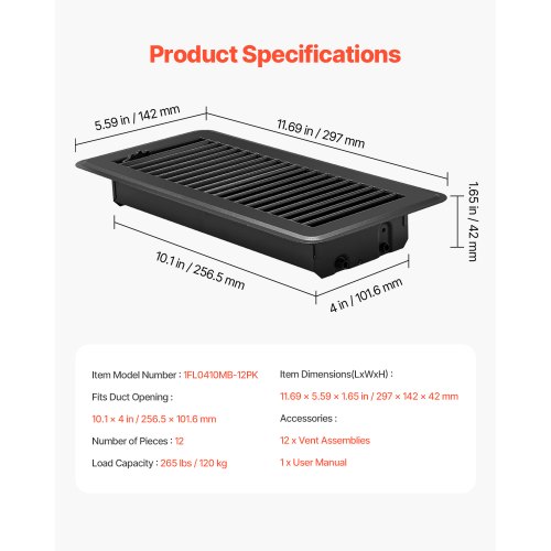 Floor Registers 4 x 10 Inch 12-Pack Iron Floor Vents for HVAC Vent Grilles BlackSleek and StylishAdjustable Airflow by LouversEffortless InstallationMulti-Purpose UseVersatile StyleMulti-Pack Options for Diverse NeedsItem Dimensions(LxWxH): 11.69 x 5.59 x 1.65 in / 297 x 142 x 42 mm,Number of Pieces: 12,Load Capacity: 265 lbs / 120 kg,Color: Black,Item Model Number: 1FL0410MB-12PK,Net Weight: 11.02 lbs / 5 kg,Fits Duct Opening: 10.1 x 4 in / 256.5 x 101.6 mm