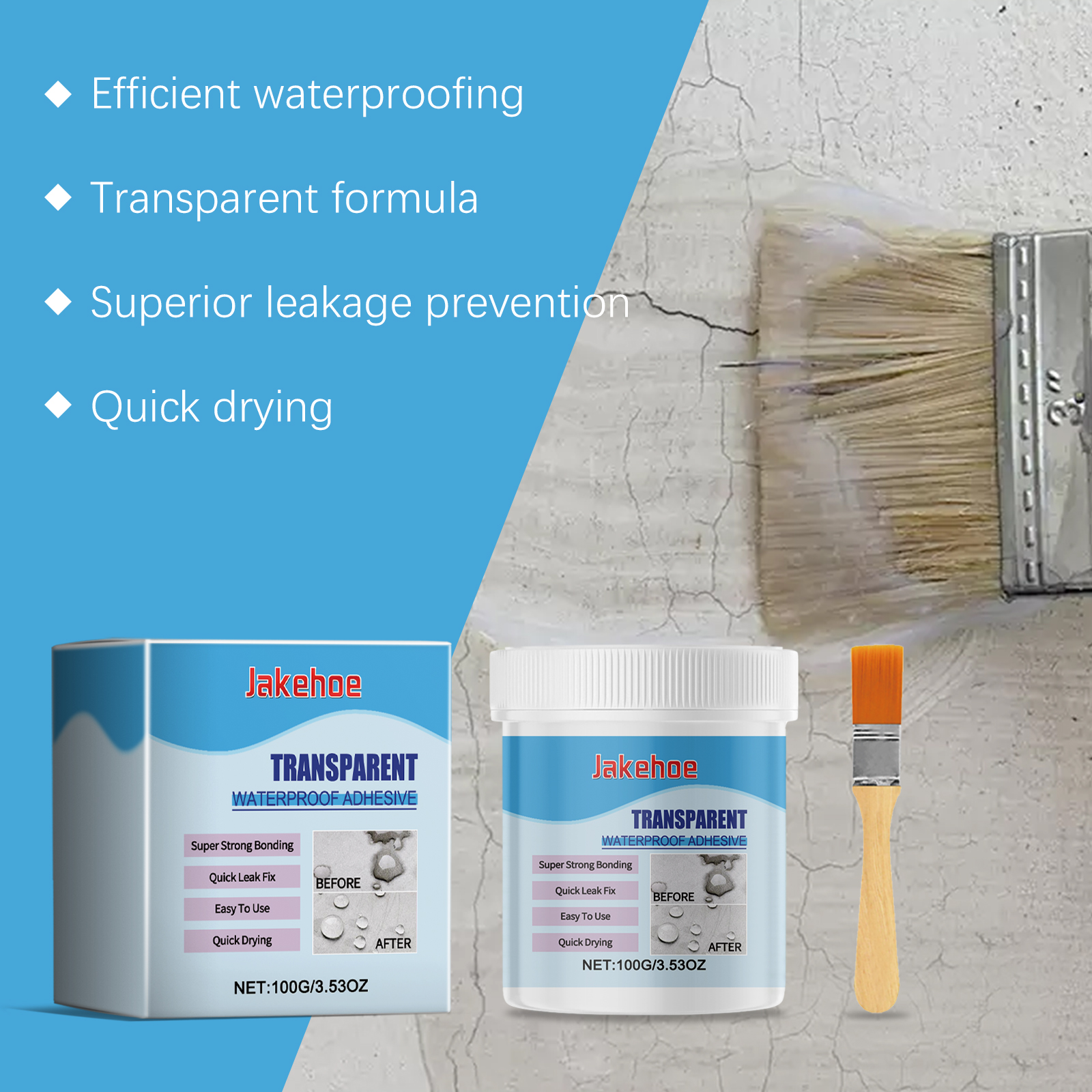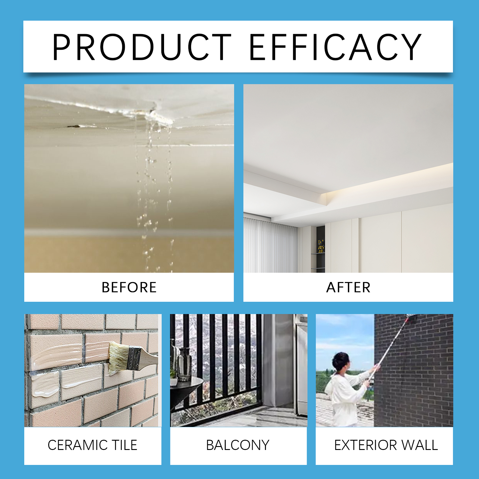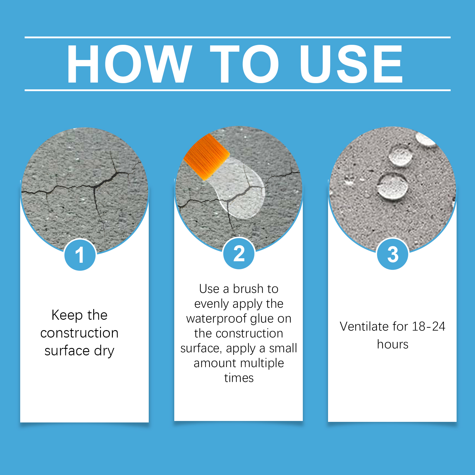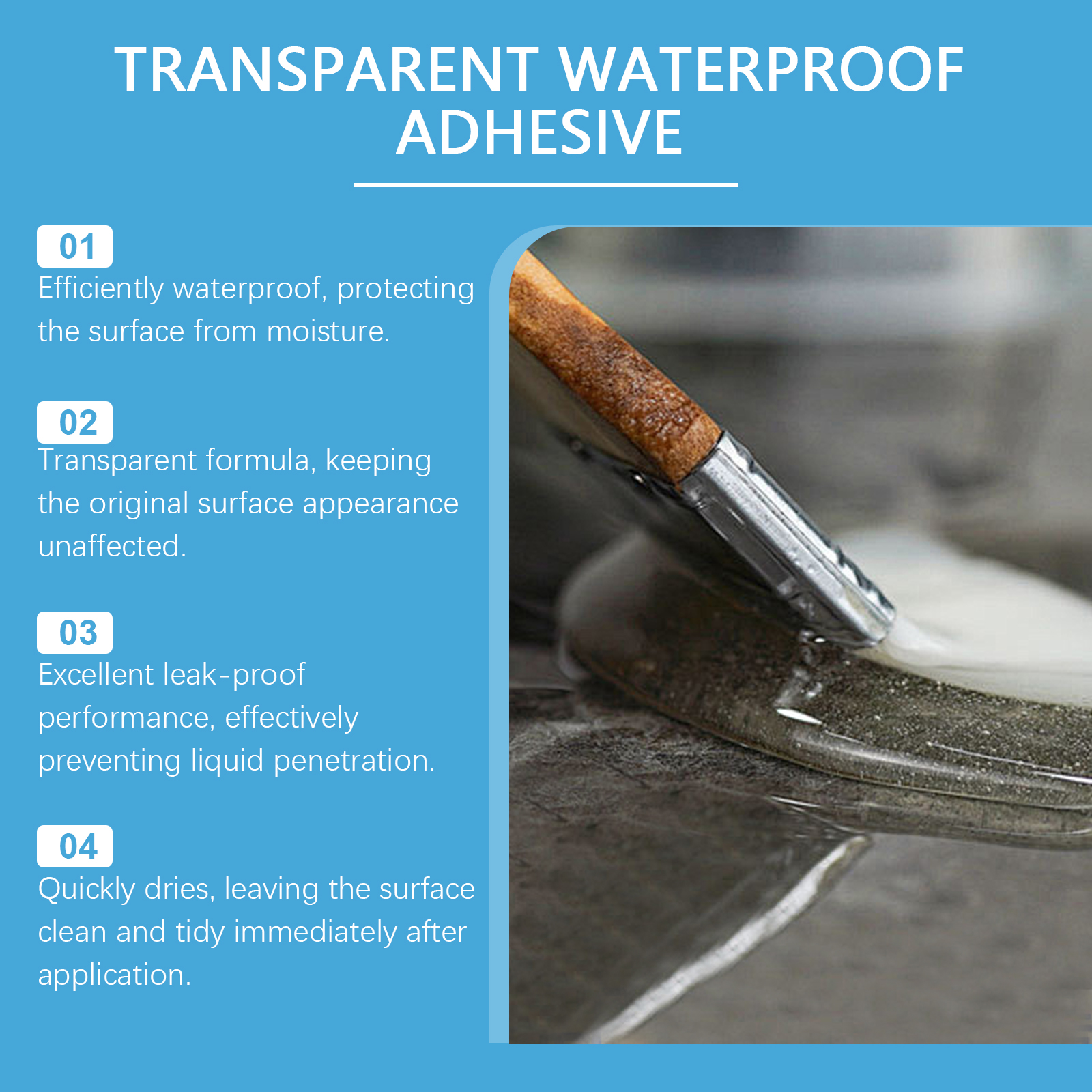 Our waterproof adhesives contain silicone acrylic emulsions and polymer copolymers. It can quickly fill the gap and form a strong sealing layer, which is waterproof for a long time. Its use is very simple: keep the construction surface dry, apply waterproof glue evenly on the construction surface with a brush, apply a small amount of multiple times, and ventilate for 18-24 hours. And increase the strength of the material to prevent water penetration.