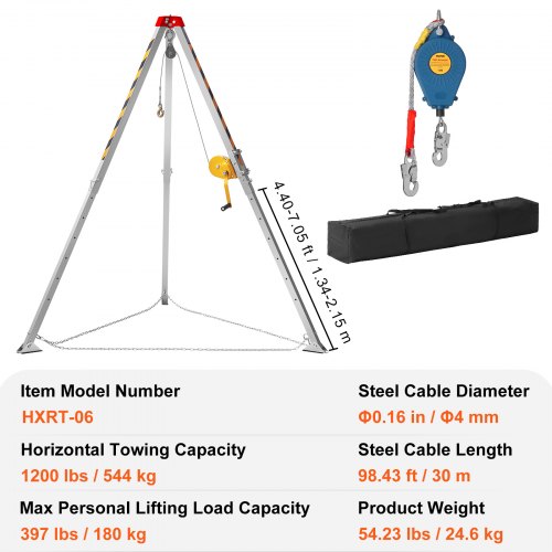 VEVOR Confined Space Tripod Kit, Confined Space Tripod 7' Legs Bracket and 98' Cable, Confined Space Rescue Tripod 32.8' Fall Protection, 1200 lbs Winch, Storage BagUnbeatable Pulling PowerIntegrated DesignRich AccessoriesEasy-Peasy AssemblyAttention to DetailVersatile and ReliableHorizontal Towing Capacity: 1200 lbs/544 kg,Adjustable Leg Length Range: 4.40-7.05 ft/1.34-2.15 m,Item Model Number: HXRT-05,Product Weight: 54.23 lbs/24.6 kg,Steel Cable Length: 98.43 ft/30 m,Steel Cable Diameter: Φ0.16 in/Φ4 mm,Max Personal Lifting Load Capacity: 397 lbs/180 kg