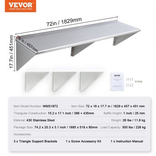 VEVOR 18" x 72" Stainless Steel Shelf, Wall Mounted Floating Shelving with Brackets, 500 lbs Load Capacity Commercial Shelves, Heavy Duty Storage Rack for Restaurant, Kitchen, Bar, Home, and HotelRugged Stainless SteelLarge Weight CapacityThoughtful DesignInstant Set-upOpen-plan DesignWide ApplicationsLoad Capacity: 500 lbs / 226 kg,Item Model Number: WMS1872,Material: 430 Stainless Steel,Baffle Height: 1 inch / 25 mm,Weight: 26 lbs / 11.8 kg