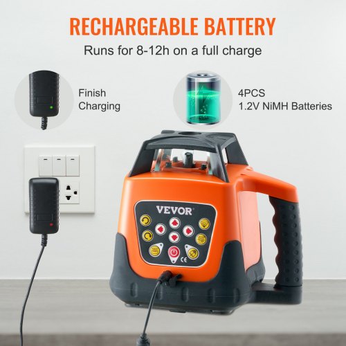 VEVOR Laser Level, 1650ft, 360 Degree Self Leveling Red Cross Line Laser, 5 Rotation Speeds & 4 Scanning Angles Adjustment, IP66 Waterproof Remote Control Manual Self-leveling Mode, Battery IncludedEase of UseRechargeable BatteryIP66 ProtectionEffortless ControlEase of OperationVersatile UseDirectional-scanning Angle: 5°, 45°, 90°, 160°,Output Power: < 5mw,Material: ABS, TPE,Power Supply: 1.2V Rechargeable Batteries,Accuracy: 1/9''/33 ft (10 m),Remote Controlling Distance: 65 ft / 20 m,Measuring Range: 1650 ft / 503 m,Item Model Number: 203HR,Leveling Range: ±3°,Item Dimensions: 7.9'' x 6.1'' x 7.5'' / 200 x 155 x 190 mm,Water-proof Rating: IP66,Spinning Speed: 0, 60, 120, 300, 600 rpm,Laser Wavelength: 635nm±10nm,Continuous Working Time: Approx. 8-12 h,Item Weight: 5.18 lbs / 2.35 kg