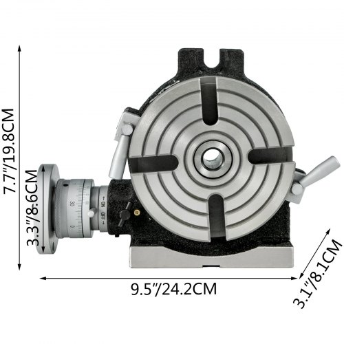 Rotary Table 6"(150 mm)_4-Slot Horizontal Vertical Dividing Plates for Milling MachineVertical & Horizontal DesignDurable Casting MaterialHighly PrecisionEasy To AdjustConsiderate Assembly KitsVarious ApplicationCentre Bore: MT-2,Plate 'B' - 21, 23, 27, 29, 31, 33:,Model: 6 inch Rotary Table,Plate 'C' - 37, 39, 41, 43, 47, 49:,Material: Cast Iron,Setting Position: Horizontal / Vertical,Item Dimensions: 9.5 x 3.1 x 7.7 inch / 24.2 x 8.1 x 19.8 cm,Table Dimension: 6 inch / 150 mm,Plate 'A' - 15, 16, 17, 18, 19, 20:,T-slot Diameter: 1/2 inch / 14 mm,Item Weight: 40 lbs / 18.18 kg