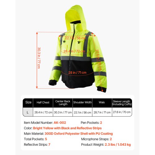 High Visibility Reflective Safety Jacket Waterproof Winter Coat Yellow-Black LWeatherproof Safety JacketRain and Wind ProtectionSecurity ReflectivityPractical Multi-Pocket DesignComfort and WarmthDust-Resistant HemSize: L,Color: Bright Yellow with Black and Reflective Strips,Center Back Length: 30.3 in/77 cm,Sleeve Length (Including Cuffs): 27.6 in/70 cm,Pen Pockets: 2,Waist: 28 in/71 cm,Item Model Number: AK-002,Half Chest: 28.4 in/72 cm,Product Weight: 2.3 lbs/1.043 kg,Microphone Straps: 2,Reflective Strips: 7,Main Material: 300D Oxford Polyester Shell with PU Coating,Total Pockets: 5,Shoulder Width: 22.1 in/56 cm